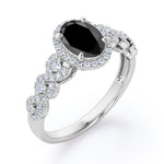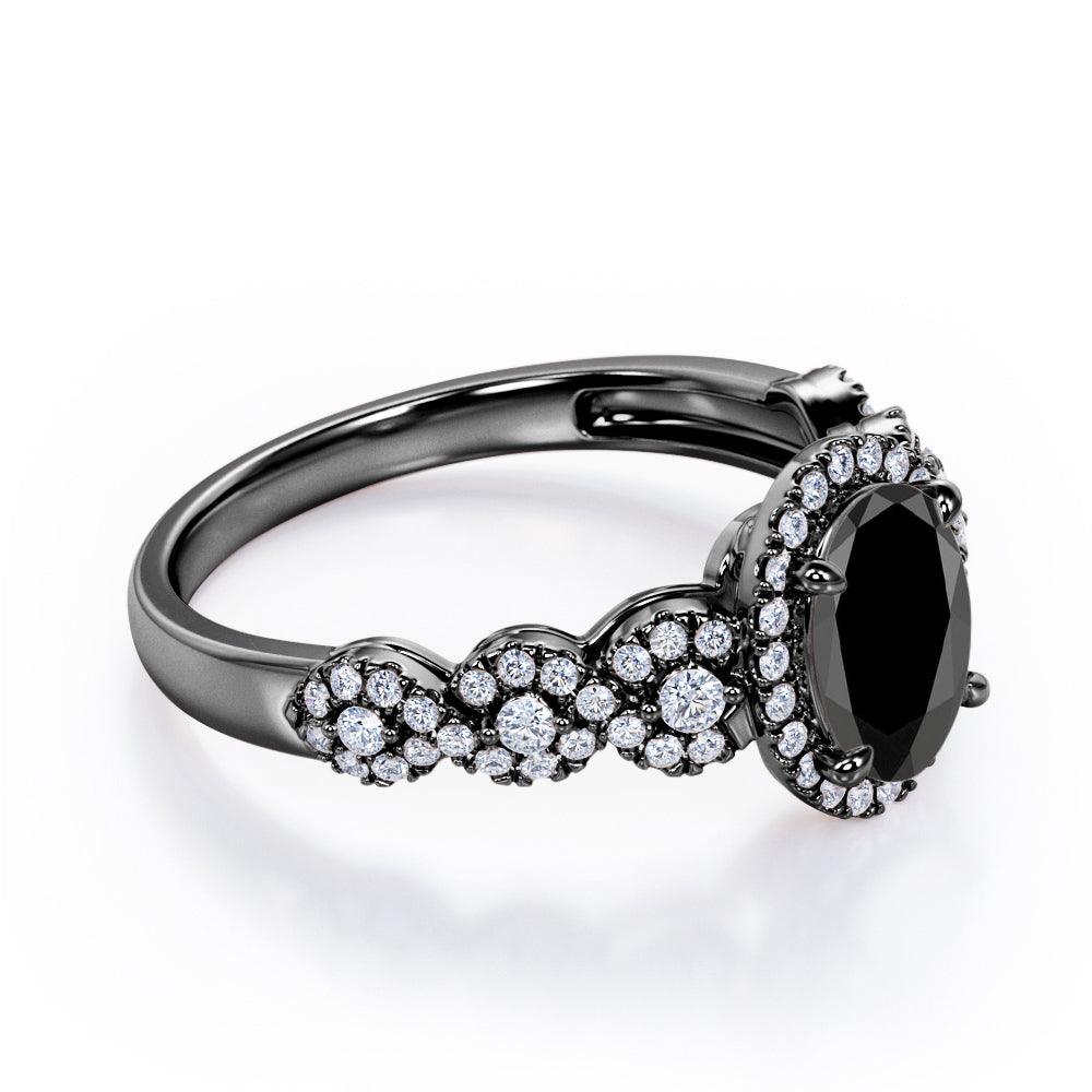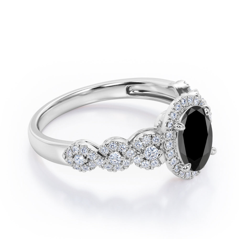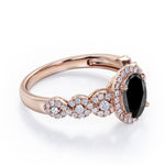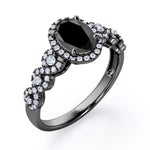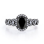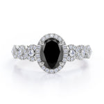 Twisted Pave Set 1.45 Carat Oval Cut Black Diamond Halo Infinity Engagement Ring In Rose Gold. Timeless and divine, this black diamond infinity ring is perfect for the minimalist bride who lean towards modern elegance. The center stone looks even more unique in an oval cut, surrounded by a halo of white dazzling diamonds. The twisted bands are set with pave diamonds that perfectly frame the oval shaped black diamond at the center. This halo engagement ring features 1 carat black diamond and 0.45 carat diamonds as the side stones. The four claws holds the center stone firmly at a place which exhibits great brilliance. This twisted 1.45 carat oval cut created black diamond halo infinity engagement ring in rose gold can also be customized to 10k Gold or 14k Gold as per your preference.