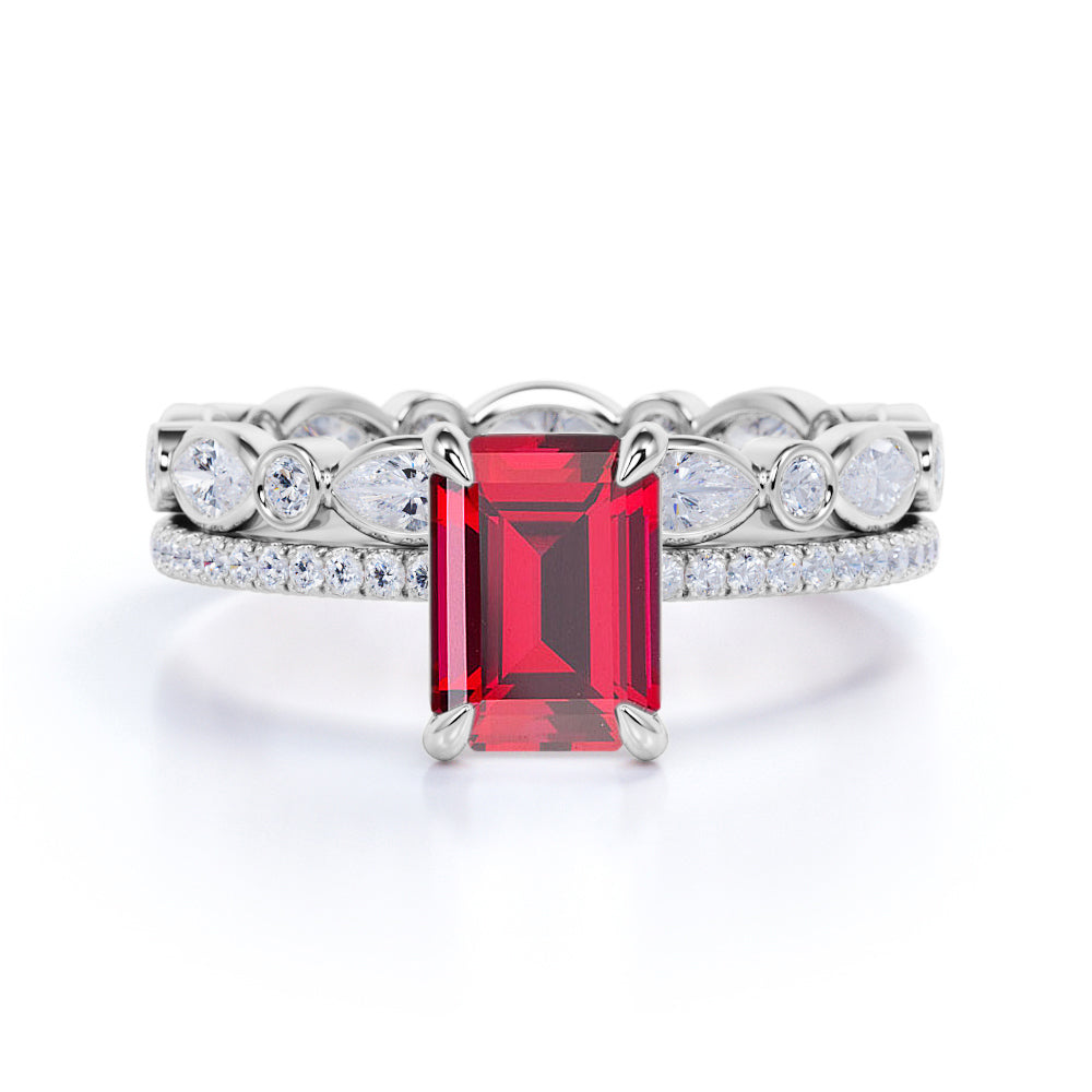 Stylish Eternity Four Claw 1.50 Carat Emerald Cut Lab Ruby and Diamond Wedding Ring Set in White Gold