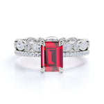 This is a stylish 1.50 Carat Emerald Cut Lab Ruby and Diamond Wedding Ring Set in White Gold. The eternity four claw wedding set is made with Lab Ruby, diamonds and on gold. The Lab Ruby bridal set ring can be made in either Rose, White or Yellow Gold, and can be customized to your choice of 10k, 14k or 18k Gold. This piece of jewelry is handmade, sporting quality craftsmanship that will last for years to come. As always, the order comes with jewelry certificate, 6 month limited warranty and 30 days full refund policy. Although each ring is handmade and customized to your specifications, we guarantee that once you placed your order, we will make and deliver it to you within 5 business days.