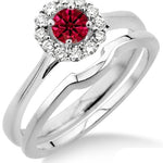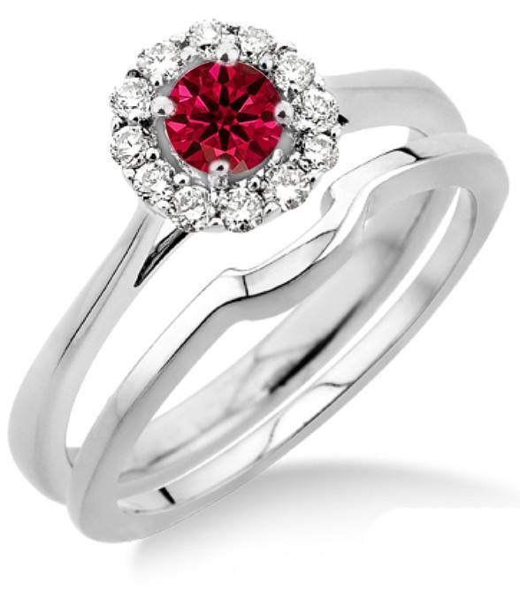 Unique 1.25 Carat Round Genuine Ruby and Moissanite Bridal Wedding Ring Set with Engagement Ring and Wedding Band in 18k Gold Over Silver