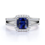 V Shank Design 1.50 Carat Cushion Cut Sapphire and Diamond Halo Engagement Ring in White Gold
