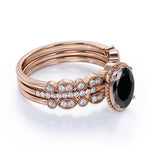 1.75 Carat Oval cut Black Diamond Trio Wedding Ring Set for Women in Rose Gold. This is a beautiful antique black Diamond wedding ring set with engagement ring and wedding bands showcases total 1.75 carats perfect lab created black diamond and glittering diamonds and is made in solid 10k Rose Gold. Get cool bohemian style with a piece of one of a kind handmade jewelry. And as always, the order comes with our 30 DAYS FULL REFUND policy, GUARANTEED DELIVERY within 5 Days, and in a BEAUTIFUL Jewelry Ring Box.