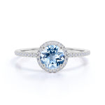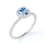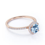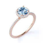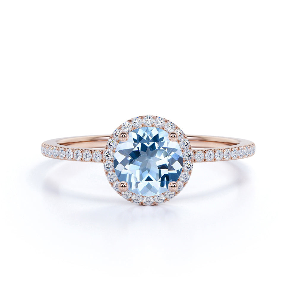 1.50 Carat Round cut Aquamarine and Diamond Halo Engagement Ring in Rose Gold