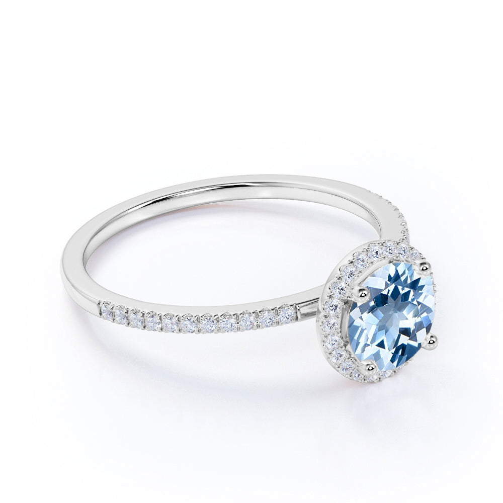 1.50 Carat Round cut Aquamarine and Diamond Halo Engagement Ring in Rose Gold. Handmadesparkling aquamarine engagement ring showcases total 1.5 carats perfect real blue aquamarine and glittering diamonds and is made in solid 10k Rose Gold. This piece of jewelry is handmade, sporting quality craftsmanship that will last for years to come.And as always, the order comes with our 30 DAYS FULL REFUND policy, GUARANTEED DELIVERY withing 5 Days, and in a BEAUTIFUL Jewelry Ring Box.
