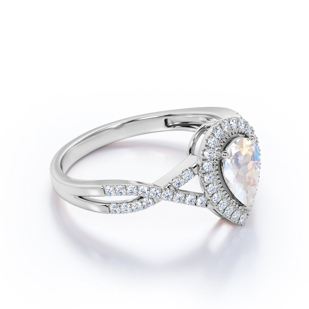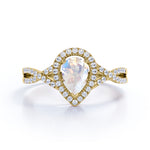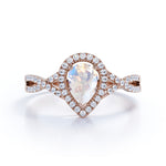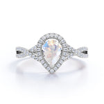 Enchanting on its own way, this rainbow moonstone infinity engagement ring displays a variety of colors from different angles when being passed by a light source. This engagement ring features an approximately 1 carat pear shape natural rainbow moonstone, surrounded by .50 carat of real diamonds for gold ring and moissanite for silver ring.