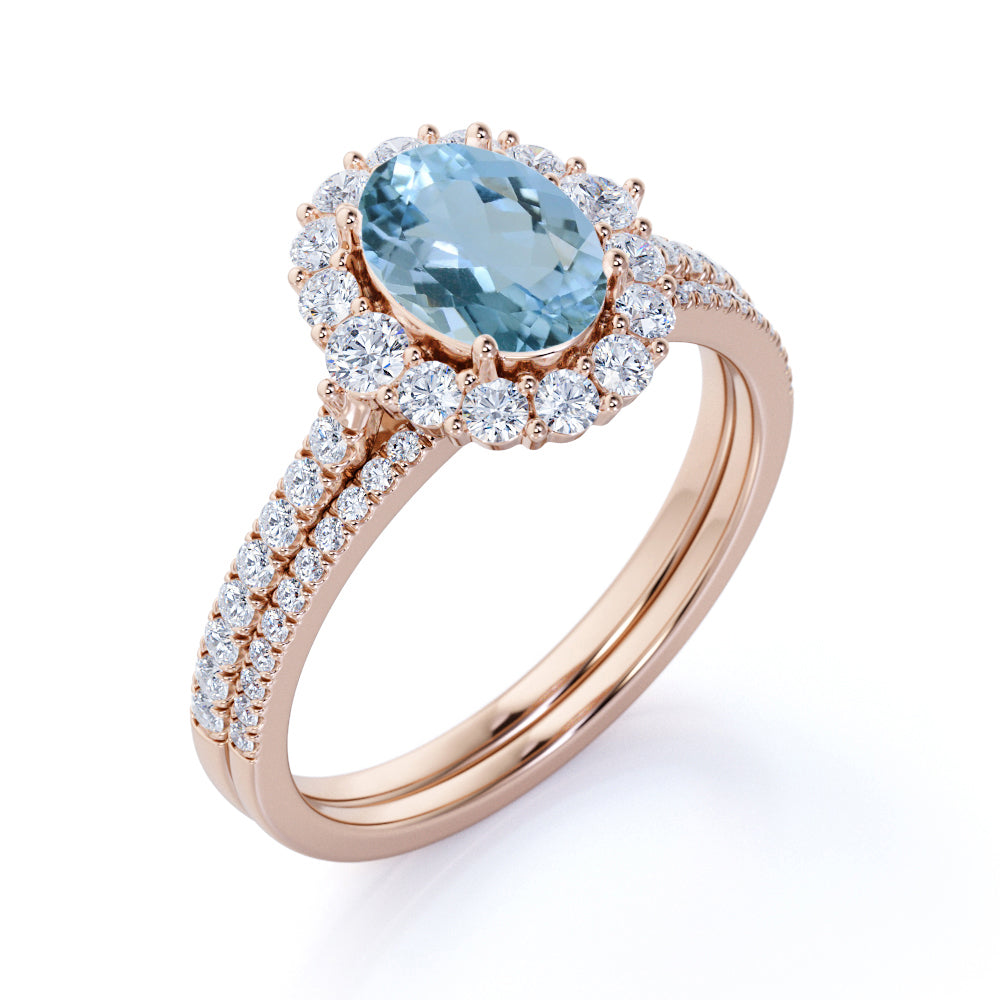1.75 Carat oval cut Aquamarine and Diamond Halo Wedding Ring Set in Rose Gold. Handmade sparkling aquamarine wedding ring set highlights 1 carat perfect real blue aquamarine and 0.75 carat glittering diamonds and is made in solid 10k Rose Gold. The beautiful wedding ring band is handmade and personalized by me or one of my other skilled jewelry associates with over 15 years of experience. And as always, the order comes with our 30 DAYS FULL REFUND policy, GUARANTEED DELIVERY within 5 Days, and in a BEAUTIFUL Jewelry Ring Box.