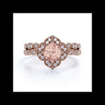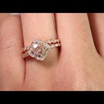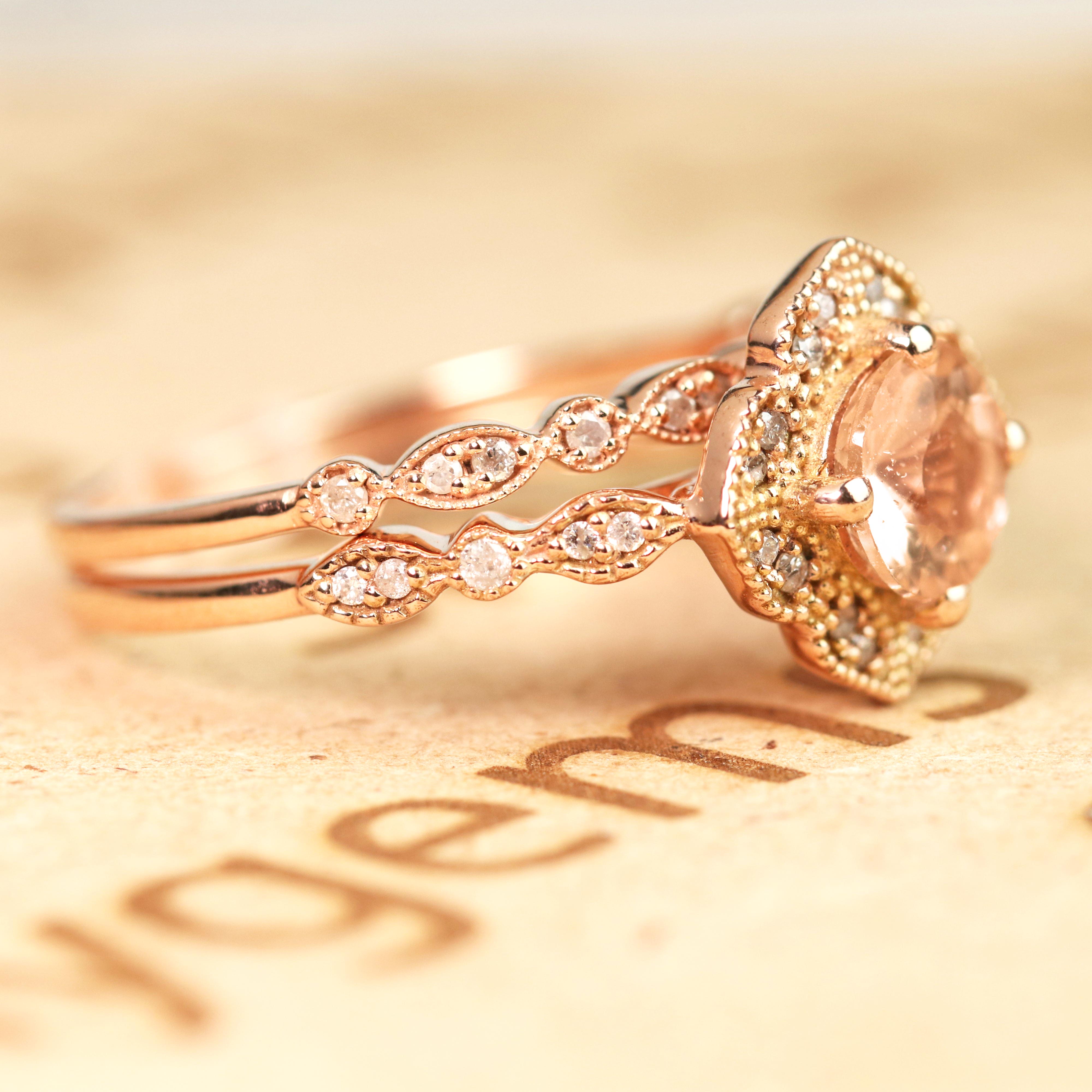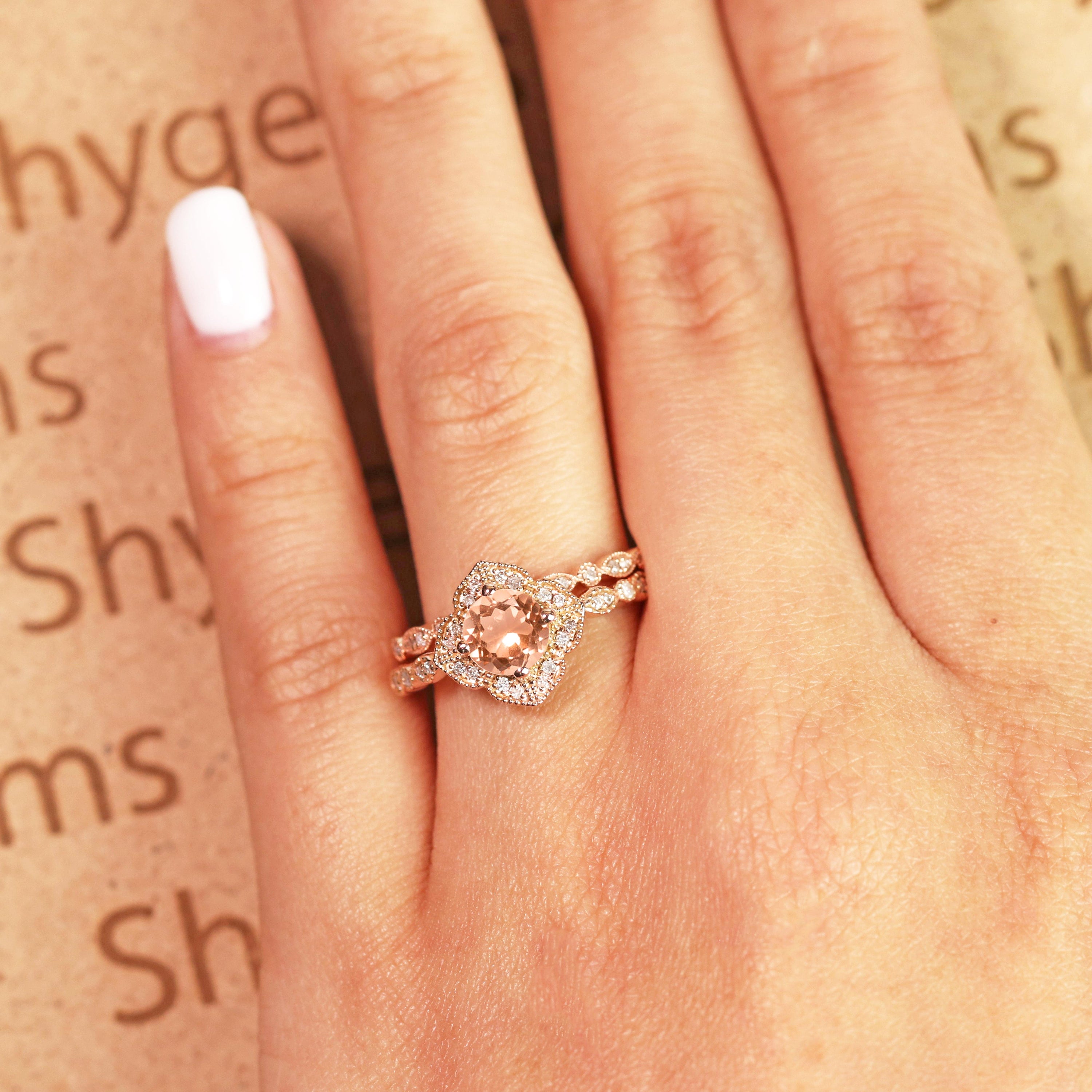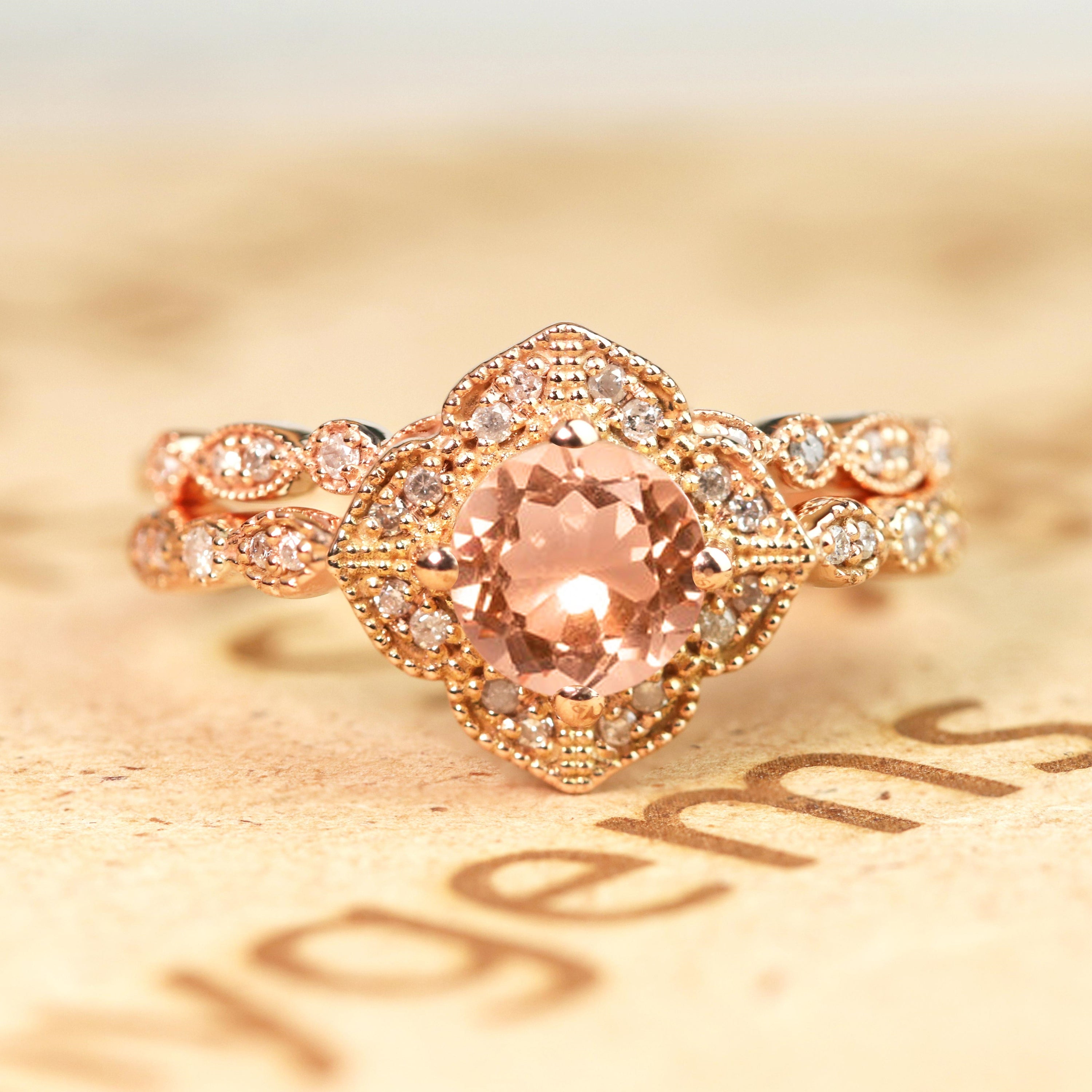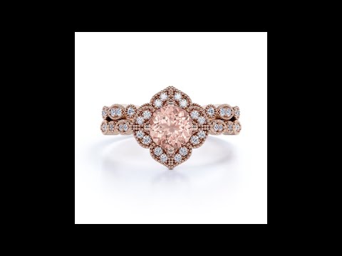 1.75 carat Round Cut Morganite and Diamond Halo Bridal Wedding Ring Set in Rose Gold: Bestselling Design. Fascinating antique art deco peach pink morganite wedding ring set features 1 carat perfect peach pink morganite with .75 carat glittering diamonds and is made in solid 10k Rose Gold. Break away from the generic look of mass-produced jewelry with this intricate handmade piece.