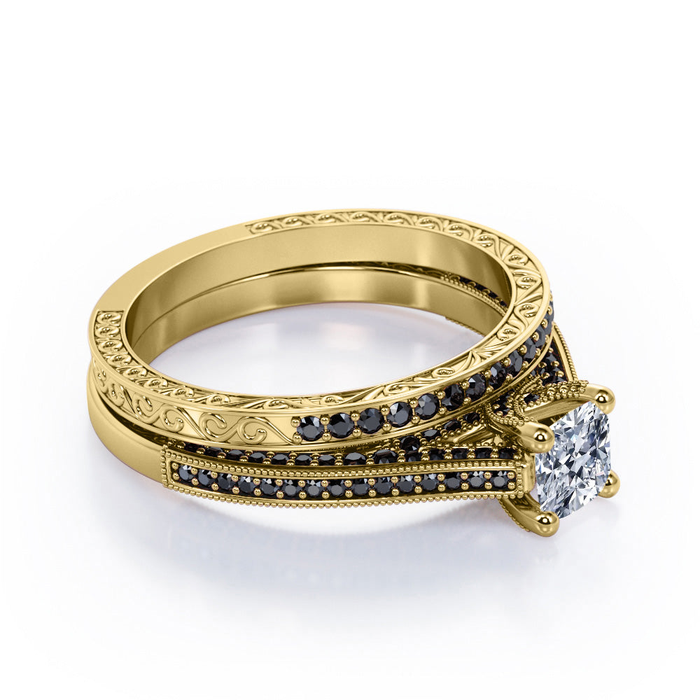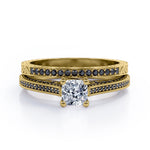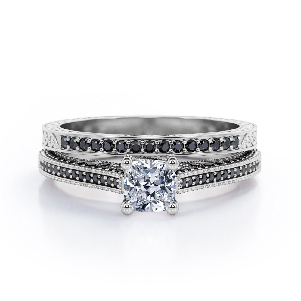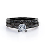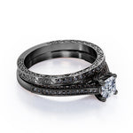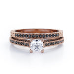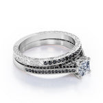 Be highly stylish with these 3 Sided Pave 1.55 TCW Princess Cut Moissanite with Lab Created Black diamond Milgrain Decorated Wedding Ring Set in White Gold. Hand-cut with deftness into a lovely shape round cut by our lapidary expertise, these exceptional engagement rings features total 1.55 carat Moissanite with lab-created Black diamond side stones on solid white gold. For those looking for something a little out of the ordinary, these Moissanite engagement rings are ideal for those who wish to express their charisma and uniqueness. with its dazzling beauty, these affordable Moissanite rings will bring joy and good energy to its wearer. These Moissanite wedding rings for women are stunning and inexpensive, thanks to its reasonable price. These Moissanite engagement rings for women, the birthstone bridal ring set for the fourth month, represents riches and extravagance and would make an excellent gift for friends or your better half. Also, these affordable Moissanite rings can be customized, so customers can choose one of metal colors between White gold, rose gold, yellow gold and black gold in 18k Gold over Silver, 10k and 14k gold metal options. Let's show her how much you care by giving her these affordable engagement rings.