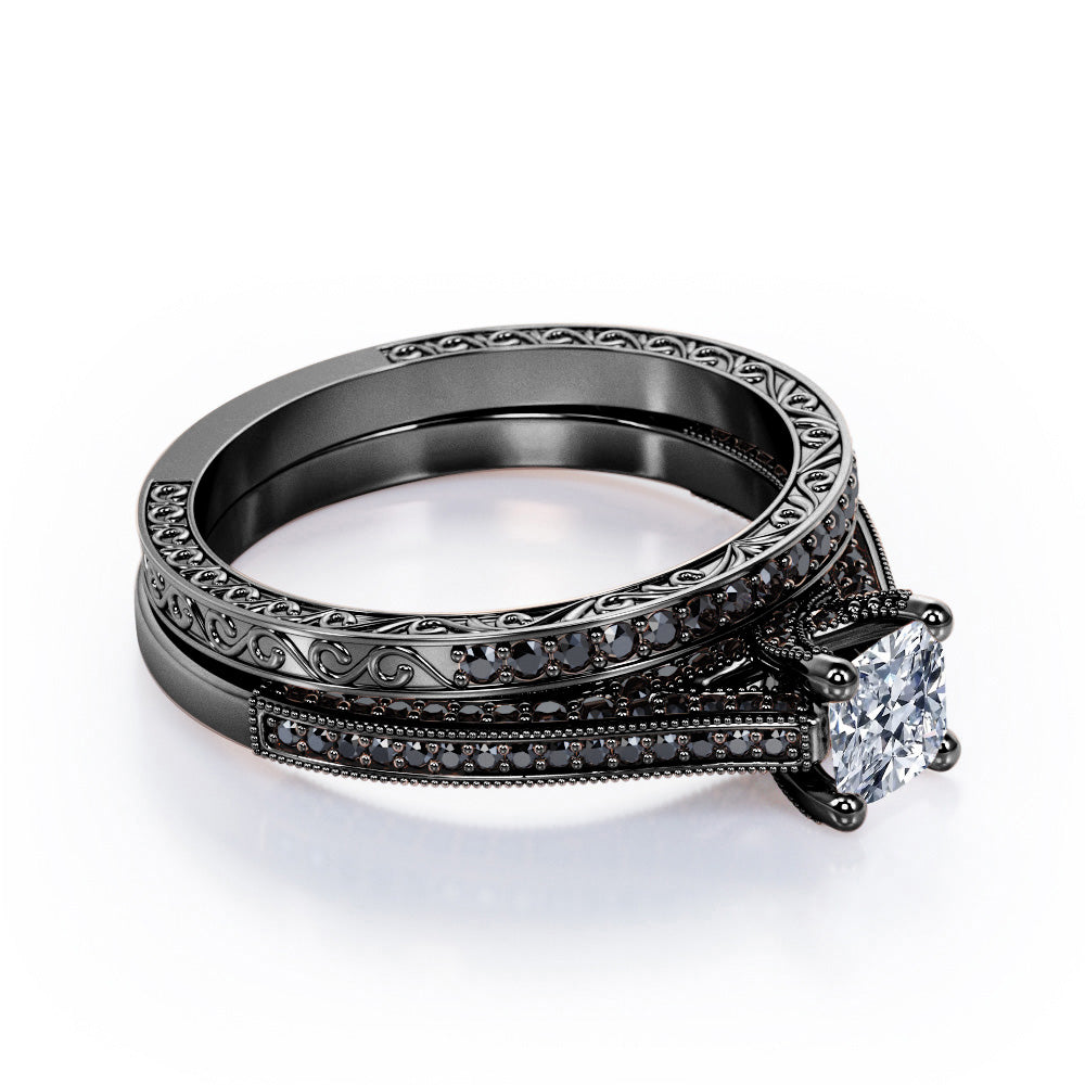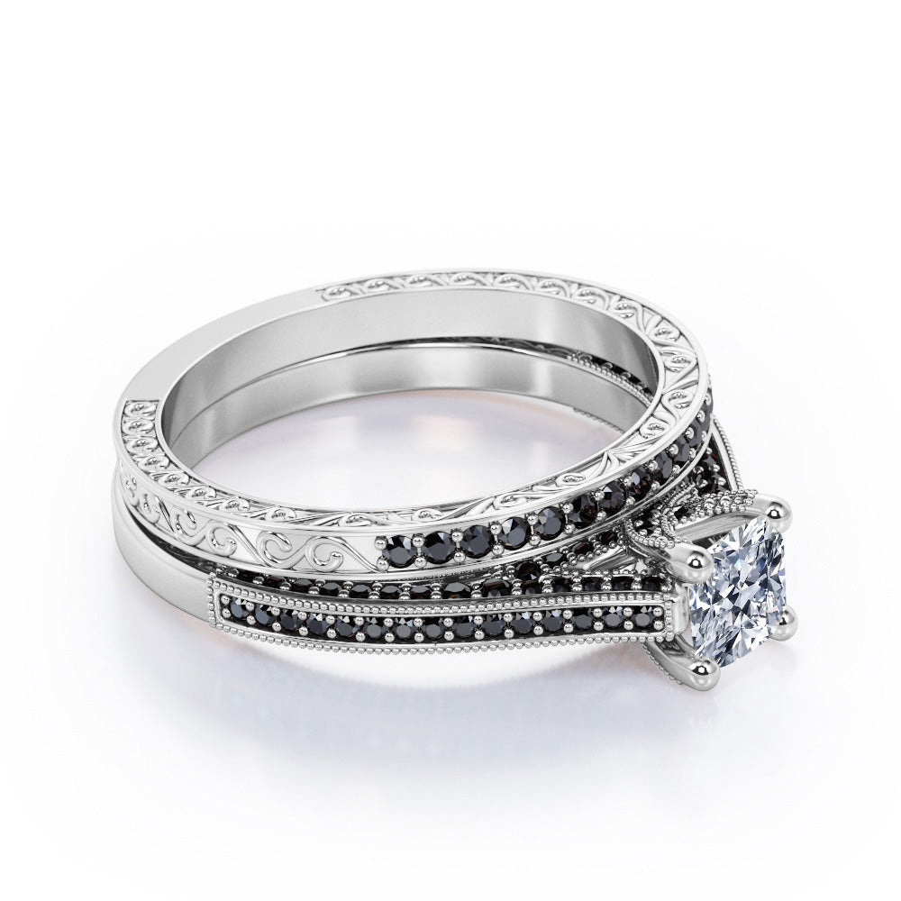 3 Sided Pave 1.55 TCW Princess Cut Moissanite with Lab Created Black Diamond Milgrain Decorated Wedding Ring Set in White Gold