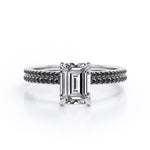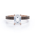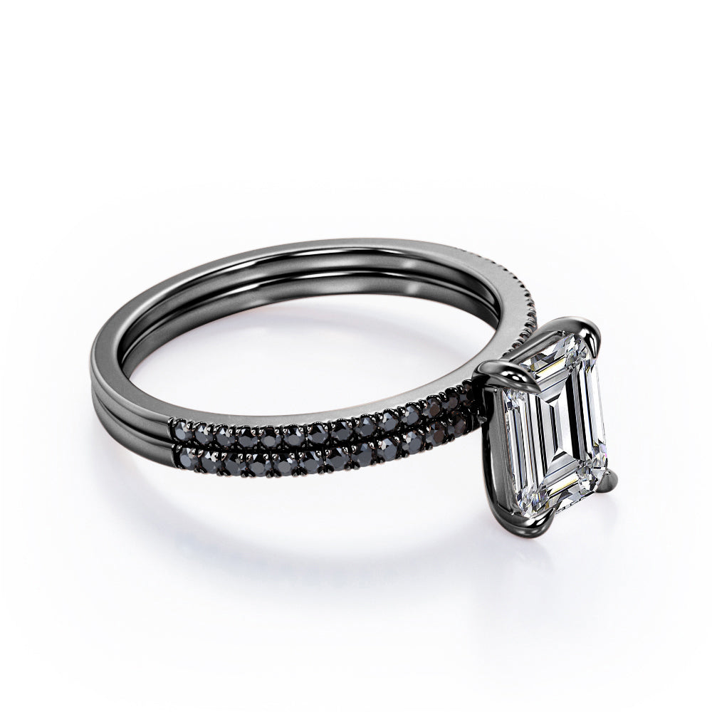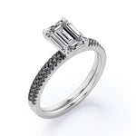 Start the greatest love story of your life with this 4-Prong Setting 1.65 TCW Emerald Cut Moissanite with Lab Created Black Diamond Wedding Set with Pave Accents in White gold. Skillfully hand-cut into a nice emerald cut by our experts in lapidary, this gorgeous moissanite anniversary band set consists of total 1.65 carat moissanite and lab-created black diamonds. Distinctive and extraordinary, this moissanite stone ring set is well-suited for those who are not quite into normal lifestyle. With naked eyes moissanites look, shine and feel exactly like diamonds. Reflective properties of this moissanite engagement rings set will enhance happiness and attract positive vibes. This moissanite engagement rings set is beautiful and accessible since it is available at an affordable price. Moissanites are the most popular alternative gemstone for diamonds while being at lower and more affordable price. If you are looking for a special gift for your friends or your better half, this moissanite promise ring set, the birthstone ring for April, symbolically representing strength and an unbreakable love, will be the greatest choice you will ever make. Additionally, this moissanite engagement ring set can be customized, either in White gold, rose gold, yellow gold or black gold in 18k Gold over Silver, 10k and 14k gold metal options upon customer request. In regards to its hardness, moissanite is almost as hard as diamond which means that it is notably durable. Let’s impress her with this silver moissanite ring set and, surely, she will not regret it.