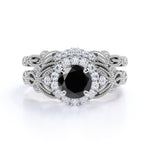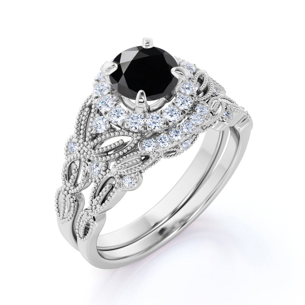 Artdeco 1.35 Carat Round cut Lab Black Diamond Wedding Bridal Ring Set in White Gold