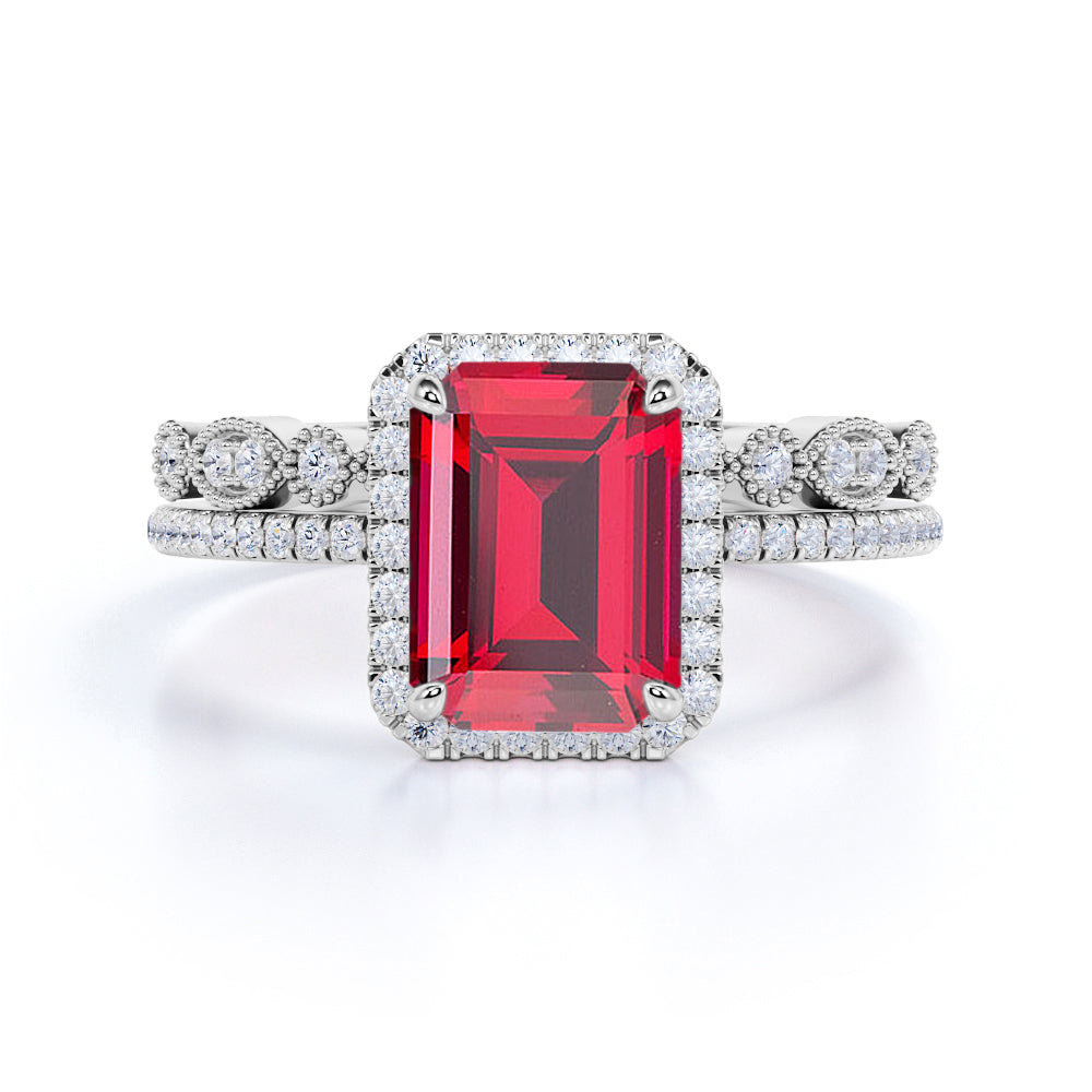 Pave Set 2 Carat Emerald Cut Lab Ruby and Diamond Wedding Set with Art Deco Band in White Gold
