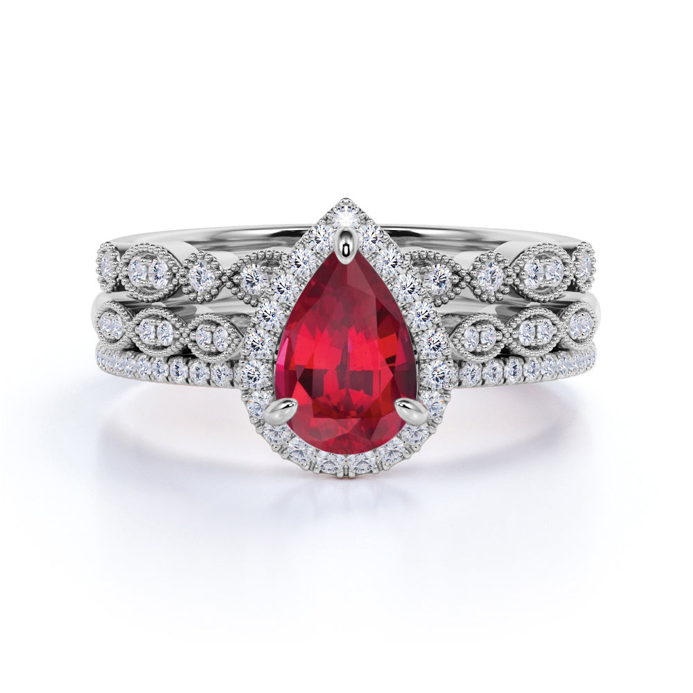 Classic Pave 2.50 Carat Pear Shape Lab Ruby and Diamond Halo Trio Bridal Set with Art Deco Bands in White Gold