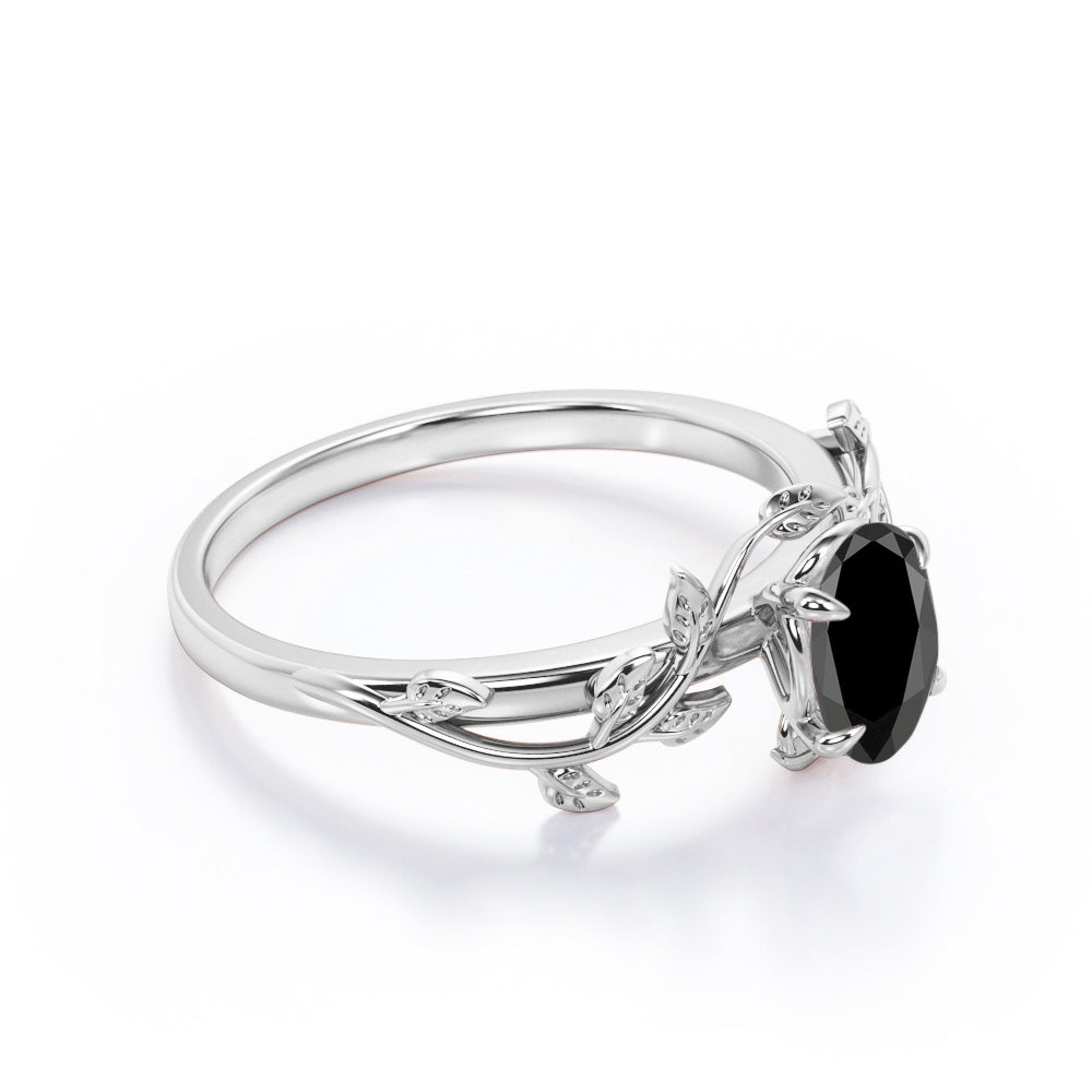 1 carat oval cut Black Diamond leaf style engagement ring in white gold. If you are hoping to hear a yes from her, just simply add this mesmerizing engagement ring into your cart. This elegant Black Diamond leaf style engagement ring will speak for you and make your proposal a memorable one. The shining Black Diamond in this ring weighs 1 carat and is comfortable to wear. This solitaire engagement ring is handmade with affection and attention by our artisans. This prong set engagement ring will do all the wonders for you to impress her. This 1 carat oval cut Black Diamond leaf style engagement ring in white gold can also be customized to 10k Gold, 14k Gold.
