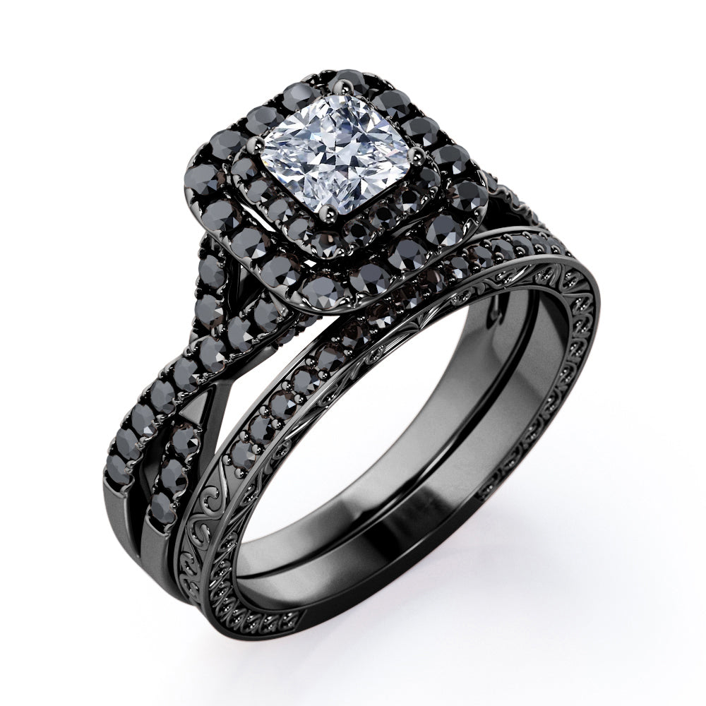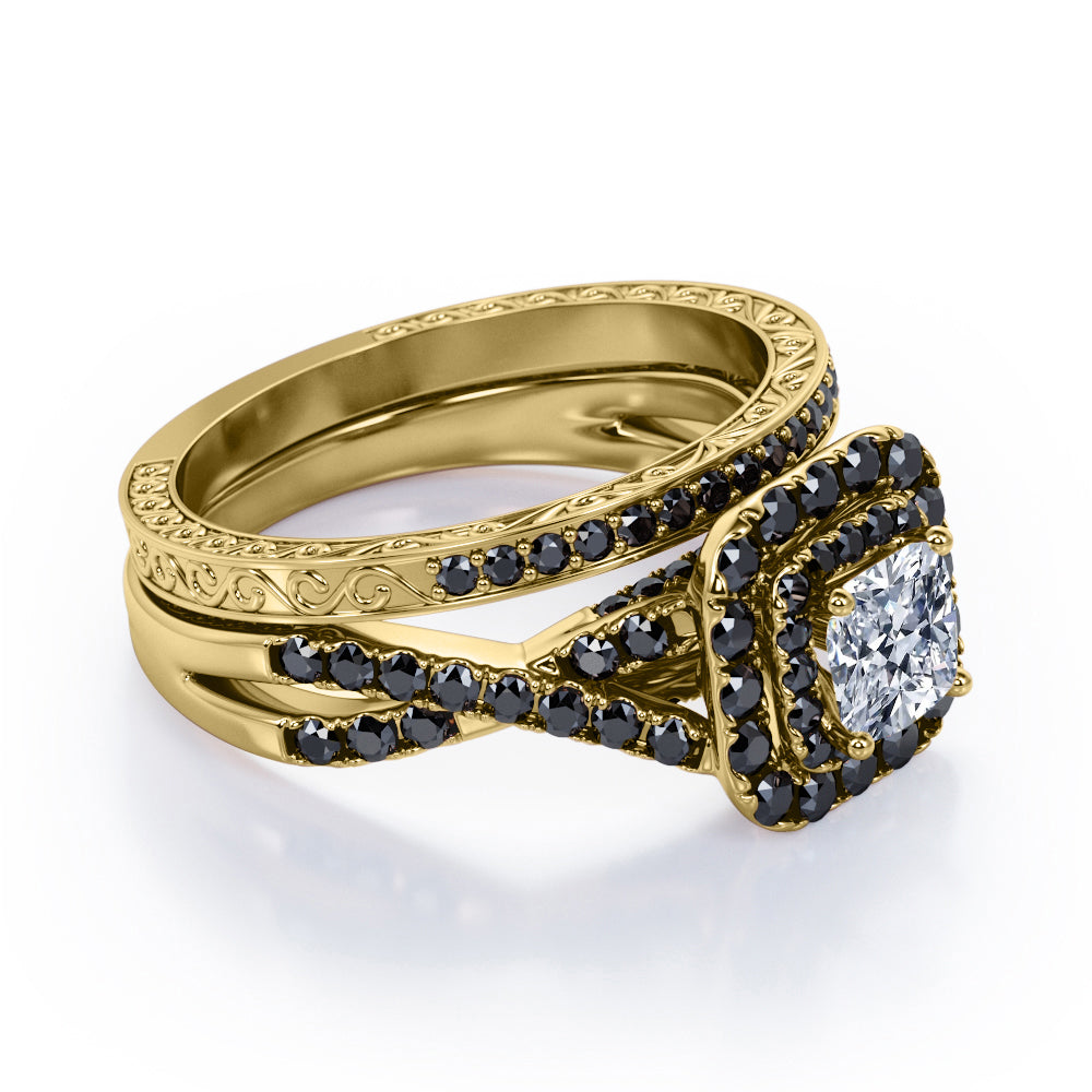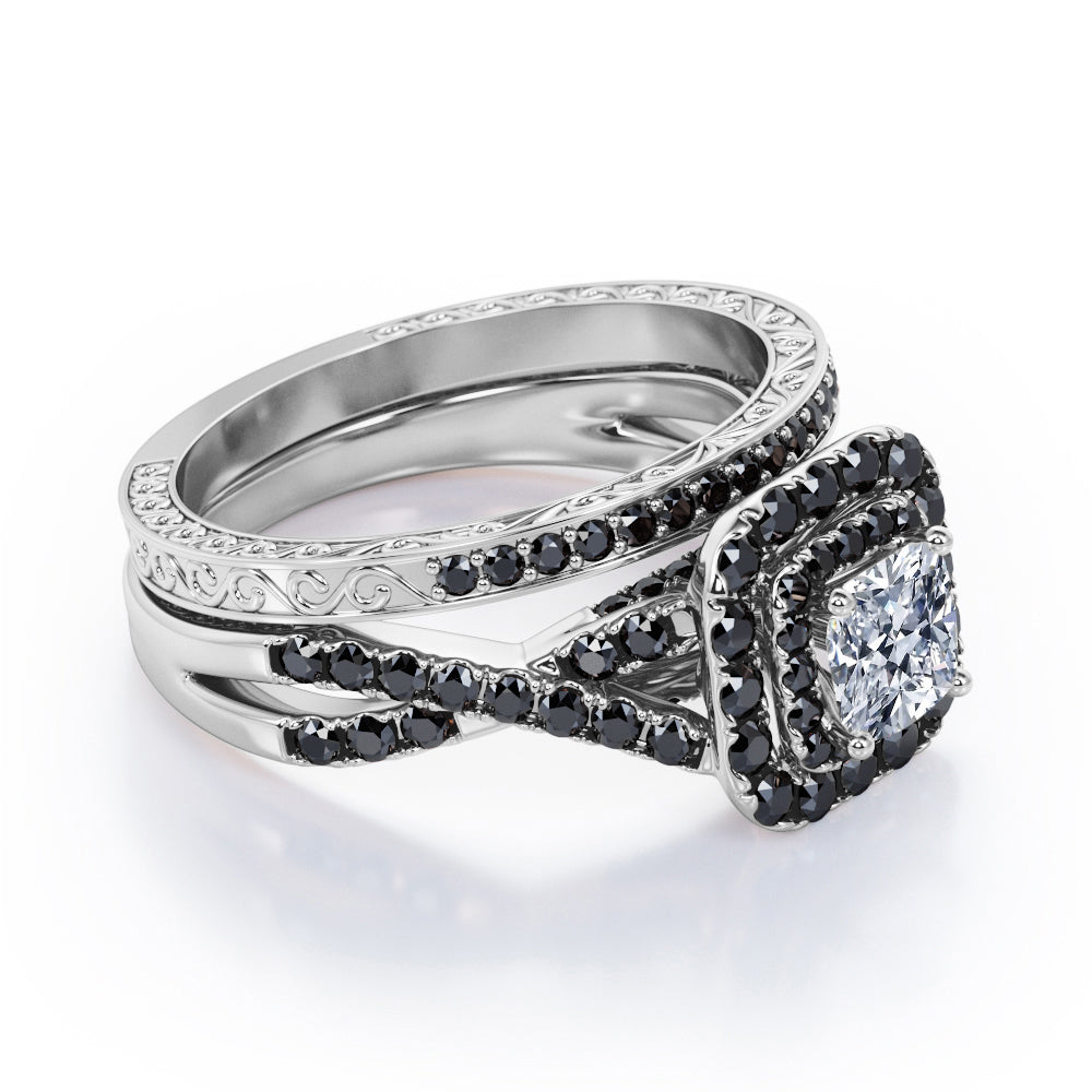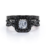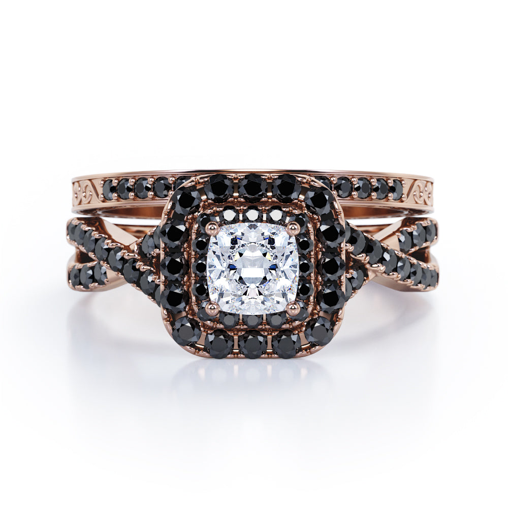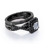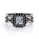 Create a memorable moment with these Filigree Twisted Pave 1.75 TCW Princess Cut Moissanite with Lab Created Black diamond Rounded Square Double Halo Bridal Set in Rose Gold. Handcrafted with care into a wonderful princess cut by our most talented jewelers, these beautiful affordable Moissanite engagement rings features total 1.75 carat Moissanite with lab-created Black diamond side stones on solid white gold. Distinct and unusual, these affordable Moissanite rings are ideal for those who wish to express their charisma and uniqueness. Refracting qualities of these Moissanite engagement rings will bring joy and good energy to its wearer. These gold and Moissanite rings are a great choice for any woman's jewelry collection. These gem engagement rings, the birthstone bridal ring set for the fourth month, represents riches and extravagance and would make an excellent gift for friends or your better half. Also, these wedding anniversary rings can be customized, so customers can choose one of metal colors between White gold, rose gold, yellow gold and black gold in 18k Gold over Silver, 10k and 14k gold metal options. Your love story will be complete with these affordable engagement rings, and she will never regret it.