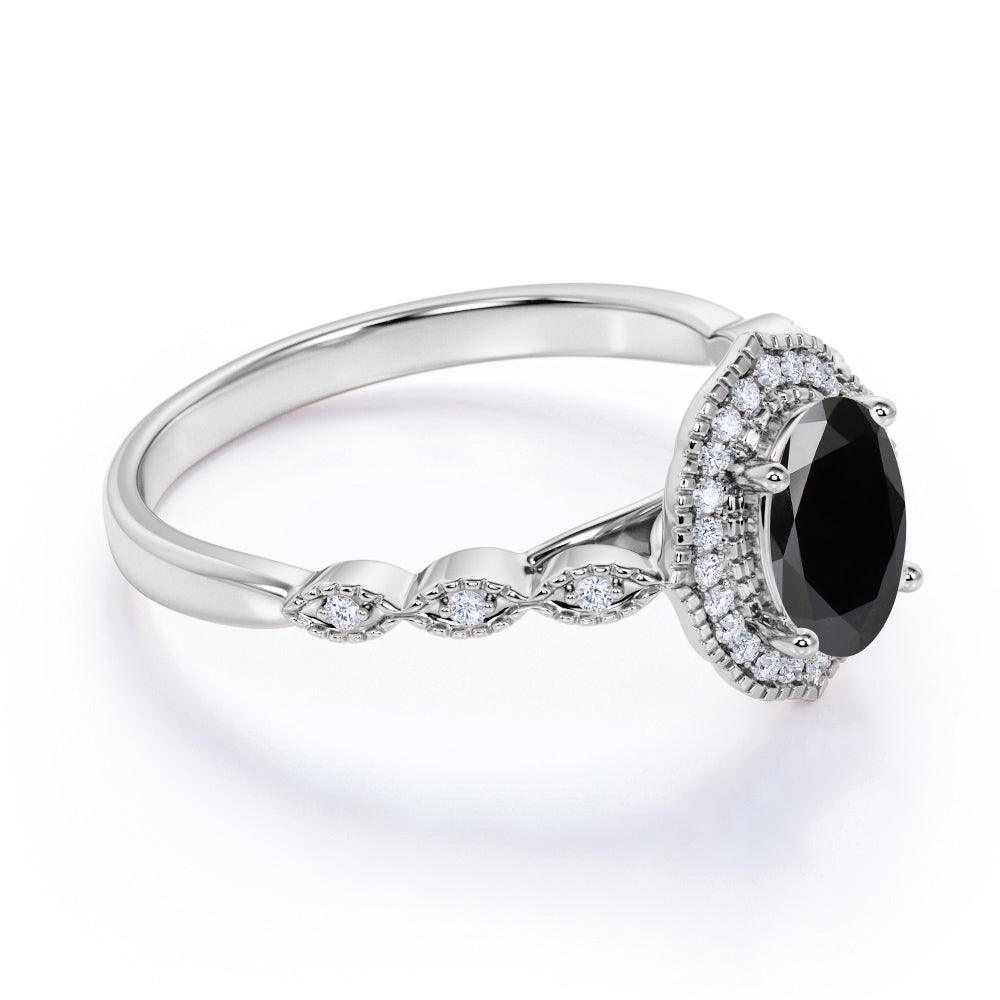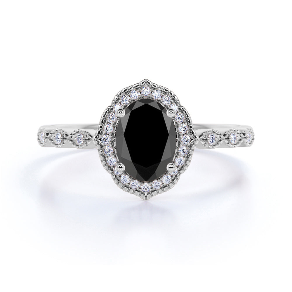 This black diamond ring is on sale, but for a limited time only and prices may increase anytime. So what are you waiting for, buy her the most affordable ring and yet uses conflict free and lab created black diamond. We can also customize this black diamond engagement ring to become an infinity or eternity band which will reflects your love for each other and that love will surely last forever because of this amazing ring. This black diamond ring features an approximately 1 carat oval shaped lab created black diamond, surrounded by .50 carat authentic diamond accent, for a total weight of 1.50 carats.