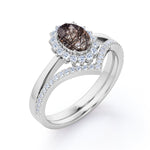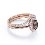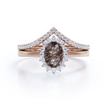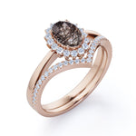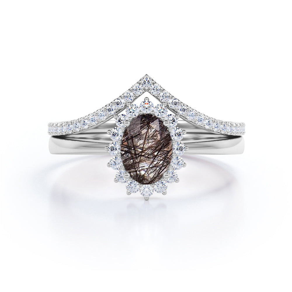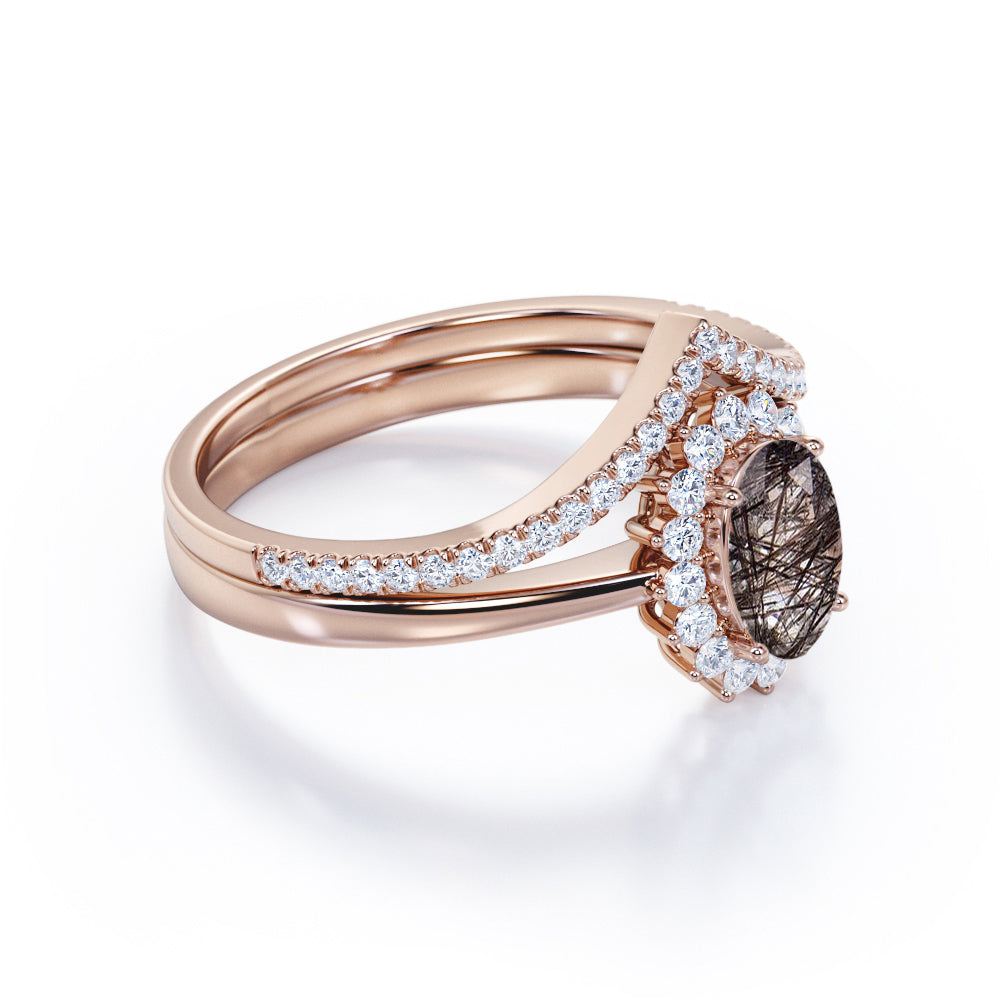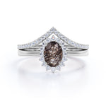 Modern Intricate Snowflake Cluster 1.50 Carat Oval Cut Solid Dendritic Black Brown Rutilated Quartz and Diamond Pave Curved Band Wedding Ring Sets for Her