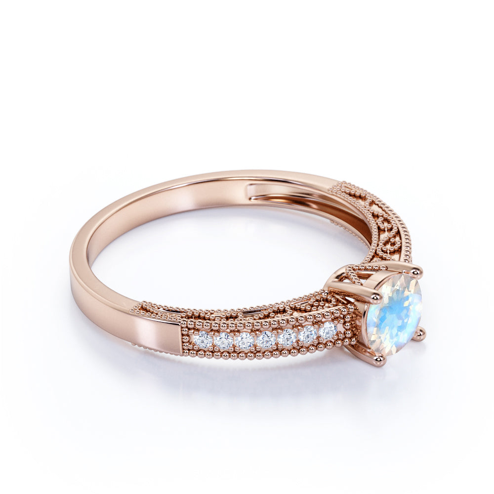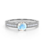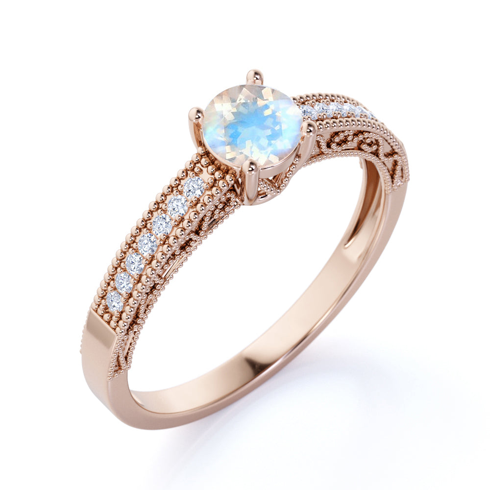 Pave Setting 1.50 Carat European Round Rainbow Moonstone and Diamond Milgrain Engagement Ring in White Gold