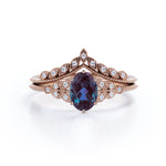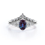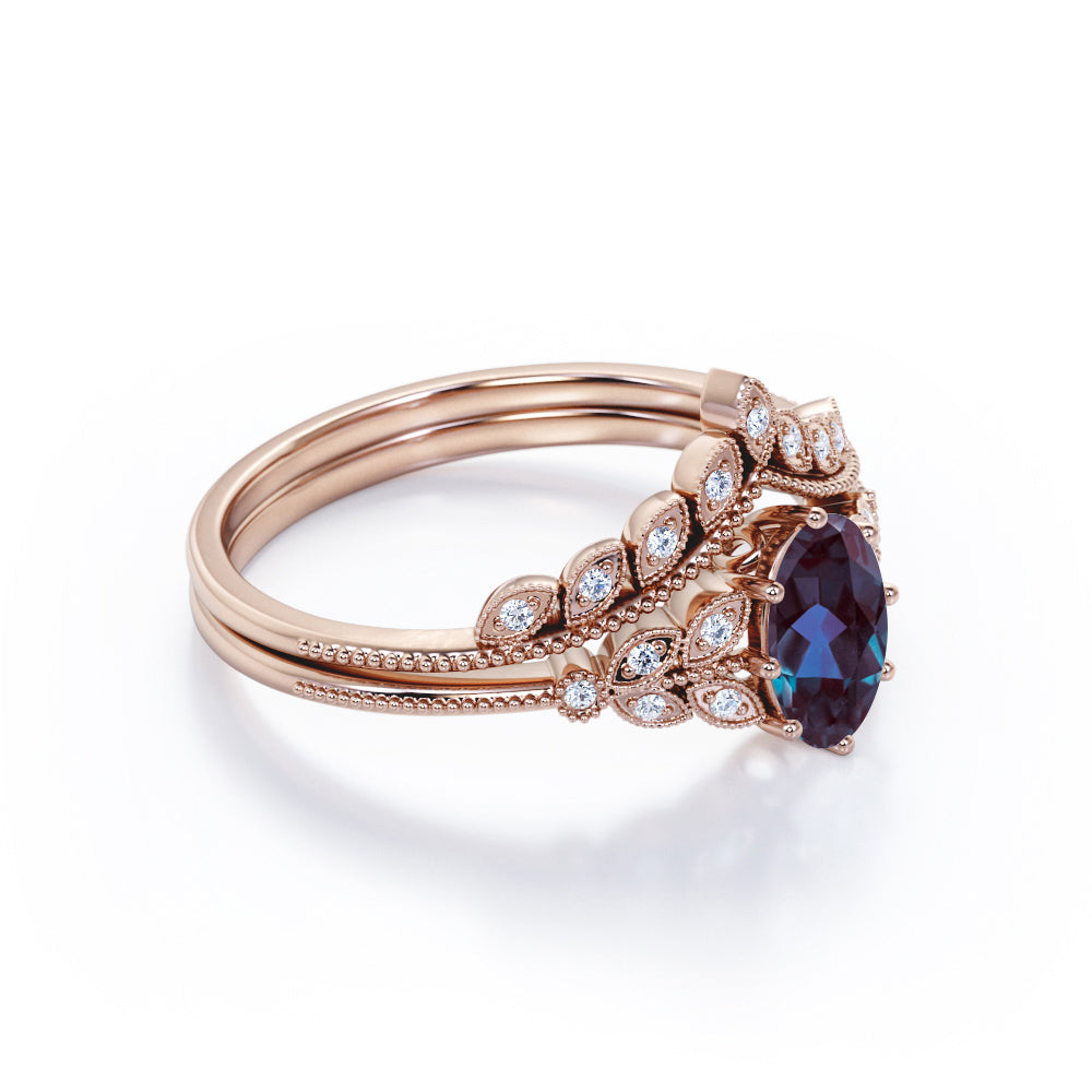 Be on cloud nine with this Unique Floral Design 1.50 Carat Oval Cut Lab Made Purple Alexandrite and Diamond Filigree Milgrain Wedding Ring Sets - Bridal Set Rings in White Gold for Women. This unique flower design synthetic Alexandrite bridal set rings feature 1 carat oval cut lab grown Alexandrite and .50 carat real genuine side diamond for gold ring and moissanite for silver ring. This art deco milgrain Alexandrite wedding ring sets can be customized to either 10k, 14K and Gold over Silver and either Black Gold, Rose Gold, White Gold or Yellow Gold. Also, as your satisfaction is our most priority, we will do our best to have your handmade jewelry be carefully and beautifully crafted by our expert jewelers. The order also comes with a 30-day full refund policy. Perfect for any occasion, this flawless artificial Alexandrite ring can be an ideal gift for anniversary, birthday, proposal, Christmas, Valentines, mother's day and more. Being one of the rarest gemstones in the world, this lab created color changing Alexandrite ring will create a charming and fascinating look on your fingers. This fascinating lab made Alexandrite ring is a perfect match for those who are looking for symbol of luck, hope and good fortune. If you are searching for some alternate gemstone, this Friday's stone lab created Alexandrite ring will be your right choice. This simulated Alexandrite ring gives a vivid grass green color in daylight and displays an intense raspberry red in candescent light. Create a fascinating look on your finger with this lab created Alexandrite ring for women which is available in both solid gold and sterling silver. This ring will bring love and hope to its wearer. This engagement ring will create a timeless and fabulous look on your finger. Sparkle your finger with this mystic lab made Alexandrite ring which is perfect for any occasion and everyday wear. It is the perfect match for those who are looking for a remarkable gemstone rings as Alexandrite embodies their own unique color-change ability and uplifting meaning.
