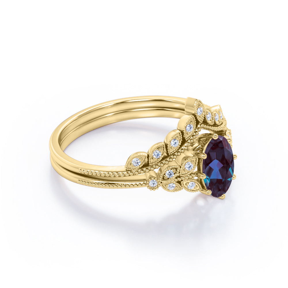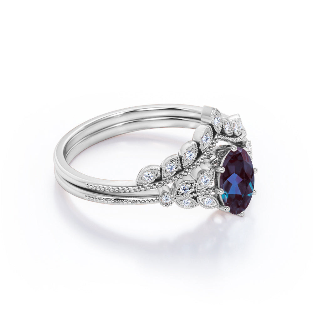 Unique Floral Design 1.50 Carat Oval Cut Lab Made Purple Alexandrite and Diamond Filigree Milgrain Wedding Ring Sets - Bridal Set Rings in White Gold for Women