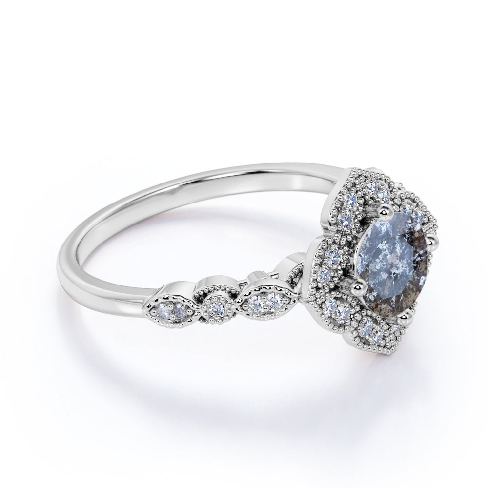 IMPORTANT NOTE: Since each Salt and Pepper Diamonds is one of a kind, the actual color of it may vary from the one that is pictured above. Handcrafted with love, this Unique Floral Style 1.25 Carat Round Cut Natural Dark Grey Salt and Pepper Diamond with Art Deco Band Wedding Ring Sets will surely be as unique as you are. This nature-inspired Salt and Pepper Diamond ring features .50 carat round cut natural Salt and Pepper Diamond and .75 carat real side Diamond for gold ring and Moissanite for silver ring. This vintage bridal set rings can be customized to either 10k, 14K and Gold over Silver and either Black Gold, Rose Gold, White Gold or Yellow Gold. Also, as your satisfaction is our most priority, we will do our best to have your handmade jewelry be carefully and beautifully crafted by our expert jewelers. The order also comes with a 30-day full refund policy. Due to its unique appearance, this ring will be a distinctive gift for all special occasions. This ring is very exclusive due to the unique inclusions of Salt and Pepper Diamond that appears black and white. If you are looking for alternate gemstone, this Salt and Pepper Diamond is right for you. It suits a variety of ring styles and easily adapted to suit any type of fashion sense. Design and create your very own unique ring that makes you outstanding from the rest! Create a fascinating look on your finger with this Salt and Pepper Diamond ring for women which is available in both solid gold and sterling silver. Those who has a penchant for vintage and flawless ring would completely fall in love with this affordable ring. If you are in search of a unique gift for any occasion, this stunning Salt and Pepper Diamond ring is the best answer for you. Handcrafted with love, this antique ring will complement any style and enhance the charm of its wearer.