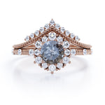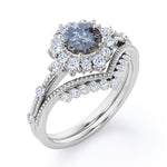 Vintage Filigree 1 Carat Brilliant Round Cut Icy Grey Salt And Pepper Diamond V shaped Halo Wedding Ring Set In White Gold. If you are an old soul vintage lover kind of person, then our exclusive natural icy grey salt and pepper diamond engagement ring would be and absolute perfect choice. Set in a cluster of smaller diamonds, this brilliant round cut salt and pepper diamond with quirky colors and inclusions is unique on its own. This halo ring is perfect for vintage lovers with the filigree and beaded art work around the band. This vintage inspired wedding ring set features 0.70 carat natural salt and pepper diamond as the center stone and 0.30 carat of glistening white round cut diamonds inclusive of the matching V shaped wedding band to complement you in any ensemble. Handmade with utmost love and detailed attention, this vintage filigree 1 carat brilliant round cut icy grey salt and pepper diamond V shaped half wedding ring set in white gold can also be customized to 18k Gold plating over silver, 10k Gold or 14k Gold as per your preferred choice.