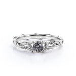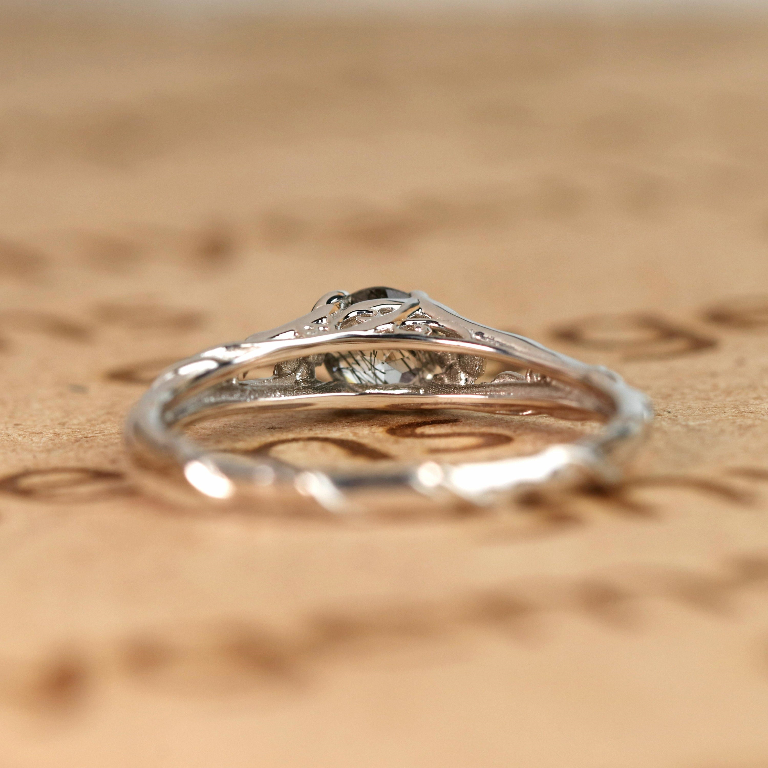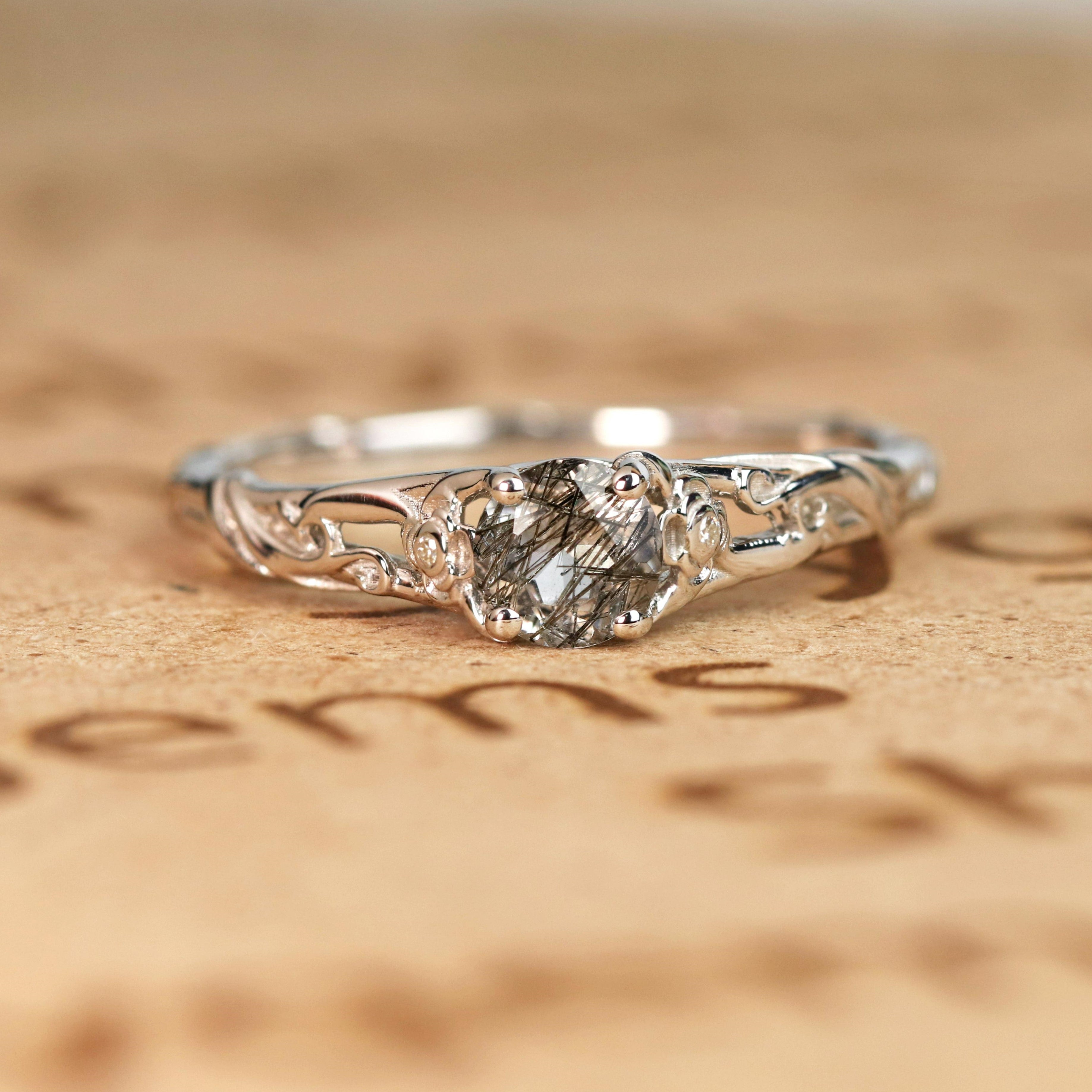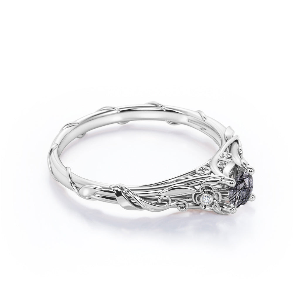 Create an incredibly beautiful look on her finger with this Vintage Three Stone 0.65 Carat Round Cut Genuine Black Rutilated Quartz Leaf Design and Diamond Engagement Ring in White Gold. This nature-inspired leaf natural rutilated quartz engagement ring features 0.50 carat round cut real rutilated quartz and .15 carat real side diamond for gold ring and moissanite for silver ring. This vintage 3 stone engagement ring can be customized to either 10k, 14K and Gold over Silver and either Black Gold, Rose Gold, White Gold or Yellow Gold. Also, as your satisfaction is our most priority, we will do our best to have your handmade jewelry be carefully and beautifully crafted by our expert jewelers. The order also comes with a 30-day full refund policy. This clear crystal with black needle inclusions ring will surely be a perfect gift for your significant other. It is crowned as a highly beneficial crystals to aid wearers in manifesting what they are desire into their lives. This tourmalinated black rutilated quartz is believed to be a protection against the ill thoughts of others. The unique dendritic black rutile within its clear quartz will surely complement every style of its wearer. With its distinctive shiny black needles, this genuine druzy rutilated quartz ring is sure to be eye-catching and bring all eyes on you. This ring is available at a very affordable price and available in both silver and gold ring. While many gemstones are most valuable when they contain few or no inclusions, rutilated quartz is actually prized because of its unique inclusions. Being an uplifted stone, this rutilated quartz ring infuses joy into your life and surrounding environment. Embellish her finger with this ring which is perfect for any occasion and everyday wear. With its mesmerizing patters of colors and inclusions, this rutilated quartz ring will enchant your special someone with gracefulness.