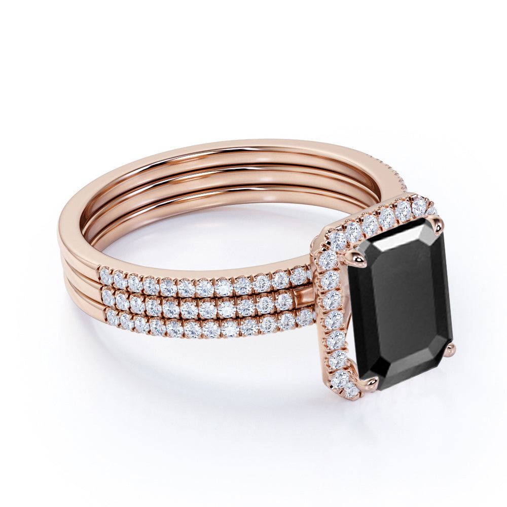 Bestselling 2 Carat Emerald Cut Lab Black Diamond Halo Trio Wedding Bridal Ring Set in White Gold