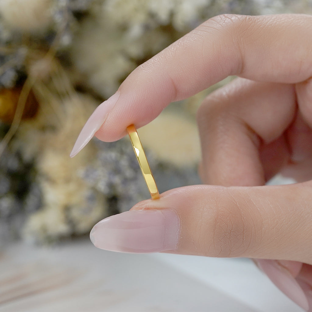 Simplicity meets elegance with this 2mm Plain Wedding Ring Band. Crafted with a sleek and minimalistic design, this band offers timeless beauty and versatility, making it the perfect symbol of your love and commitment. The classic 2mm width ensures a comfortable fit while exuding understated sophistication. Ideal for everyday wear or as a complement to your engagement ring, this wedding band is a beautiful choice for those who appreciate subtle elegance. Shop now and cherish this timeless piece forever. This wedding band can be customized in 18K white, rose, yellow, or black gold over silver, or in 10K, 14K, and 18K gold, based on your preference.