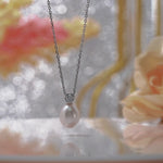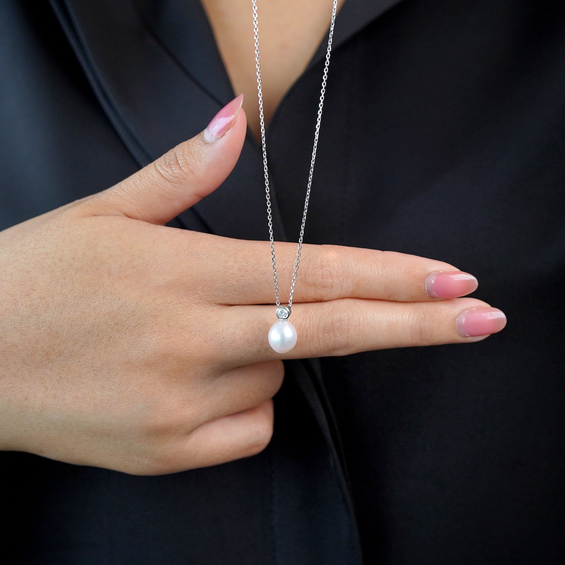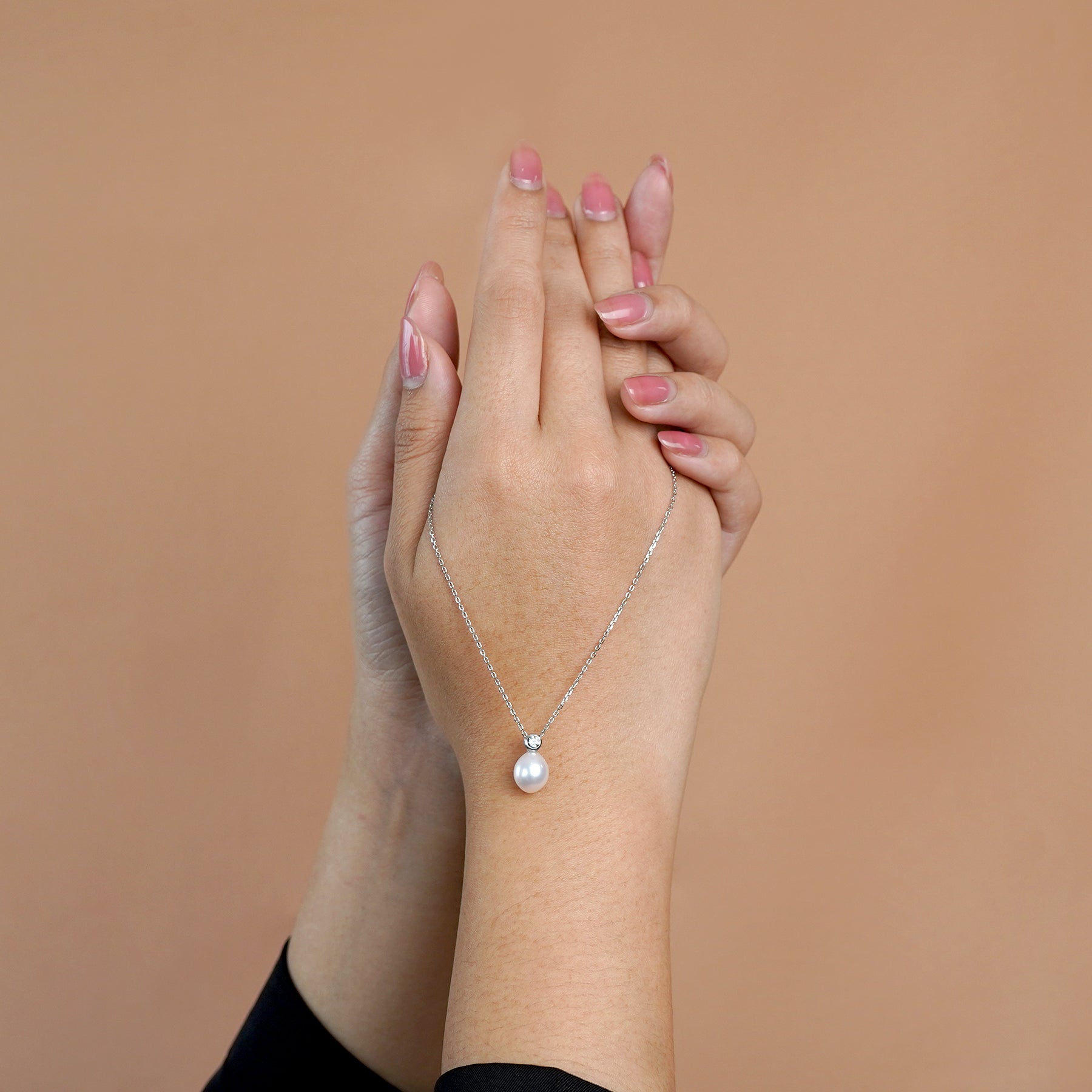 Embellish your graceful neck with our Akoya White Freshwater Pearl and Round Cut Diamond Bezel Setting Pendant Necklace in 18K White Gold over Silver. Made with love and care from our jewelers, the cultured pearl necklace feature 8x10 MM white Akoya pearl and a sparkling diamond in a bezel setting in 18K White Gold over Silver. The white Akoya pearl pendant hangs down beautifully from the chain. On top of it is decorated with our blazing brilliance round cut diamond in a bezel setting which further brings out the beauty of the pearl pendant necklace. The real pearl necklace is suitable for those who love classy and timeless beauty. The white shades of our pearl necklace women will surely brighten you up and bring out your unique beauty. Because of the shine and luster of the natural pearl, this classic stone has always been a beloved jewel in every wardrobe. This pearl pendant necklace is a true elegance at an affordable price. In addition, this mother of pearl necklace is suitable for every occasion for example, as gifts on Valentine's Day, Mother's day, Birthday, Anniversary, or simply an addition to your precious collection. Cherish your beloved ones with this Akoya White Freshwater Pearl and Round Cut Diamond Bezel Setting Pendant Necklace in 18K White Gold over Silver.