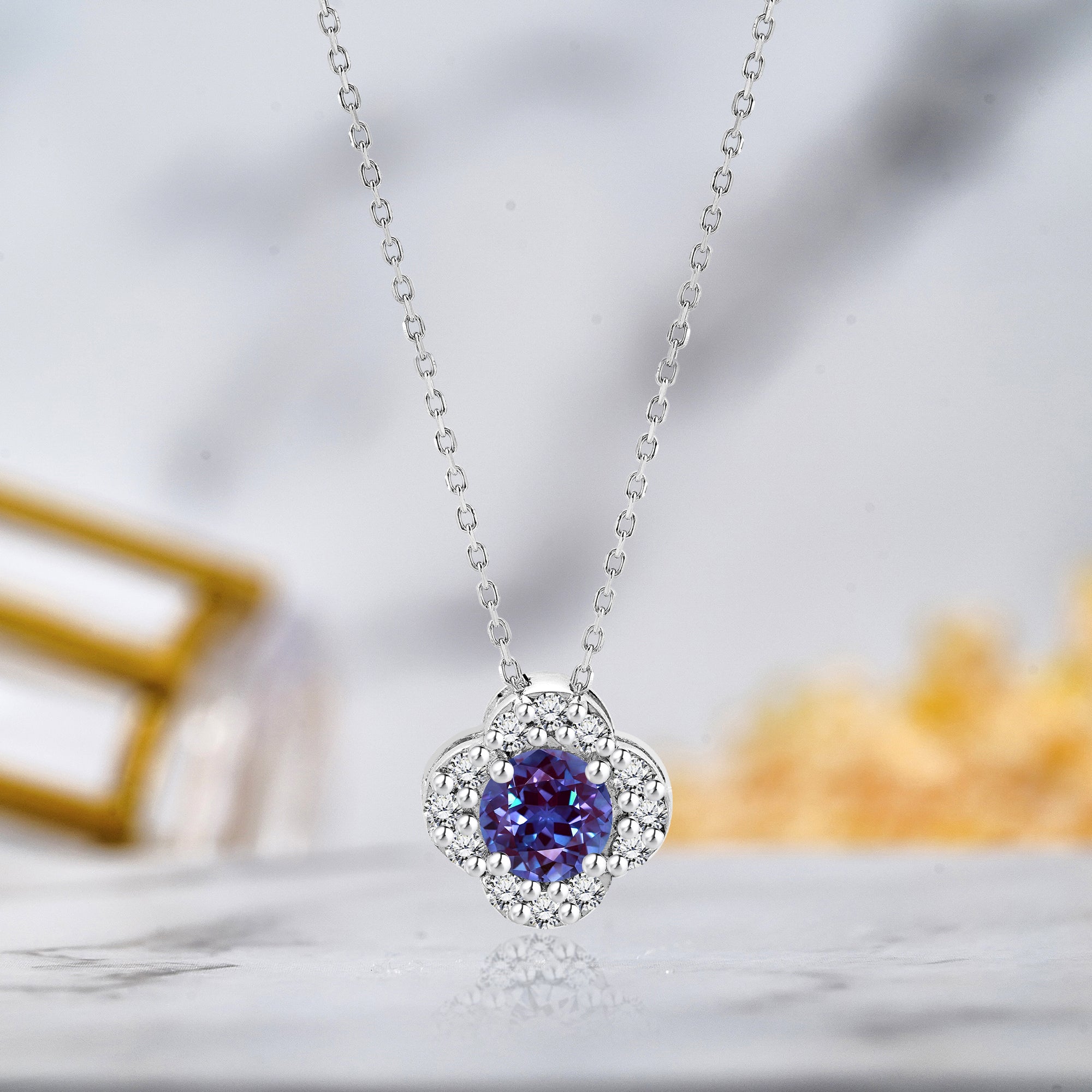 Beautiful 1.15 Carat Flower Halo Round Shaped - Alexandrite - June Birthstone Pendant Necklace in 18K White Gold over Silver