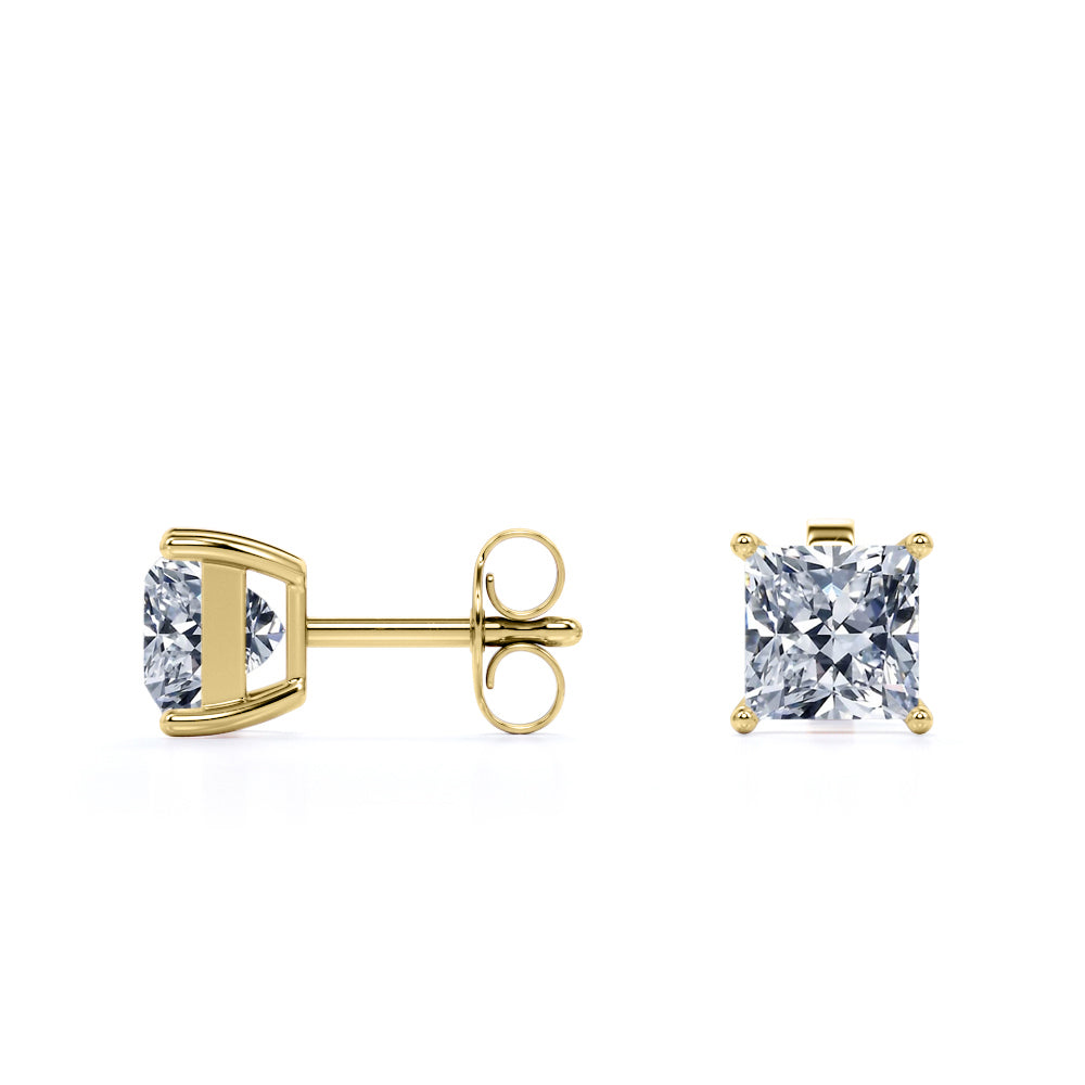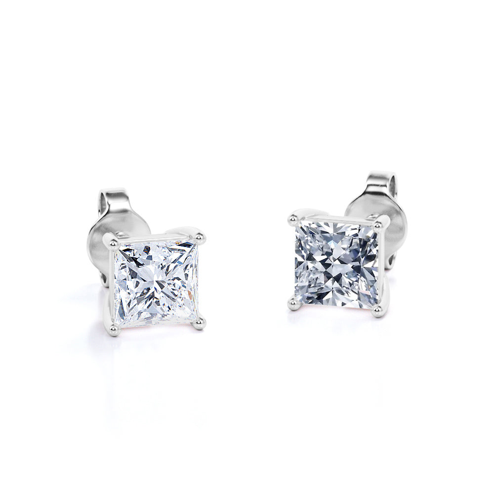Be highly fashionable with these Certified 2 Carat Princess Cut Moissanite 4 Prong Solitaire Stud Earrings In 18K Rose Gold Plating Over Silver. Professionally handcrafted into a fine princess cut by our experts in lapidary, these astonishing moissanite solitaire earrings feature 2 carat moissanite on rose gold plating over silver, and each side of the earrings weighs 1 carat. Special and non-traditional, these moissanite stud earrings is perfect for those who would love to express their charisma and uniqueness. With naked eyes moissanites look, shine and feel exactly like diamonds. With its splendor, these moissanite screw-back stud earrings will absolutely enhance every style of its wearer. These moissanite stud earrings are beautiful and accessible since it is available at a reasonable price. Moissanites are the most popular alternative gemstone for diamonds while being at lower and more affordable price. These moissanite screwback earrings can be a good choice for any special occasion, i.e. birthday, mother's day, Valentines' day, etc. Also, these moissanite solitaire earrings can be customized, so customers can choose one of metal colors between 18K rose gold plating over silver, 18K white gold plating over silver, and 18K yellow gold plating over silver. In regards to its hardness, moissanite is almost as hard as diamond which means that it is notably durable. Let's fulfill your love story with these moissanite screw-back stud earrings and, surely, she will not regret it.