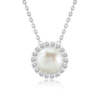 Floating Moissanite Halo 8 mm White Pearl Necklace Pendant in 18K White Gold over Silver