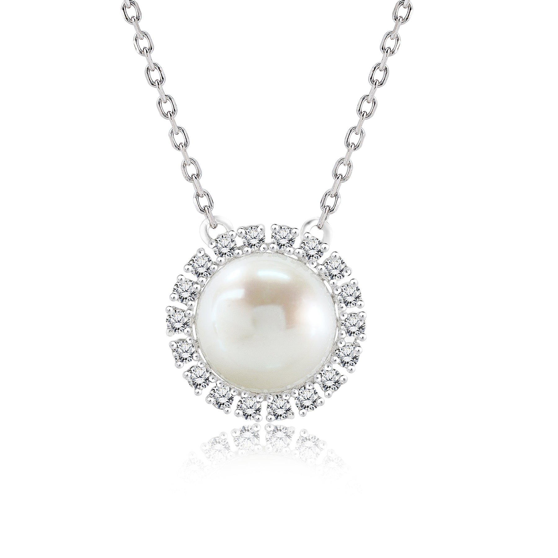 Become extraordinarily classy with this Floating Moissanite Halo 8mm White Pearl Necklace Pendant, meticulously crafted in 18K White Gold over Silver. This single pearl necklace pendant is pure class at affordable price, making it a coveted accessory for every occasion from an everyday wear to all special occasions. At the center of this moissanite and pearl floating necklace lies an illuminating 8mm pearl which is surrounded by a halo of moissanite that contains a total carat weight of 0.26 carat, further highlighting its radiance. This freshwater pearl renowned for their natural beauty and captivating iridescence, this pearl charm for necklace exudes elegance and grace. Suspended within a dazzling halo of shimmering moissanite stones, the pearl appears to float effortlessly, creating a mesmerizing visual effect for the pearl halo pendant necklace that is sure to turn heads. Expertly crafted with attention to detail, this pearl pendant necklace pendant offers exceptional value, ensuring that you get the most out of your investment without compromising on quality.