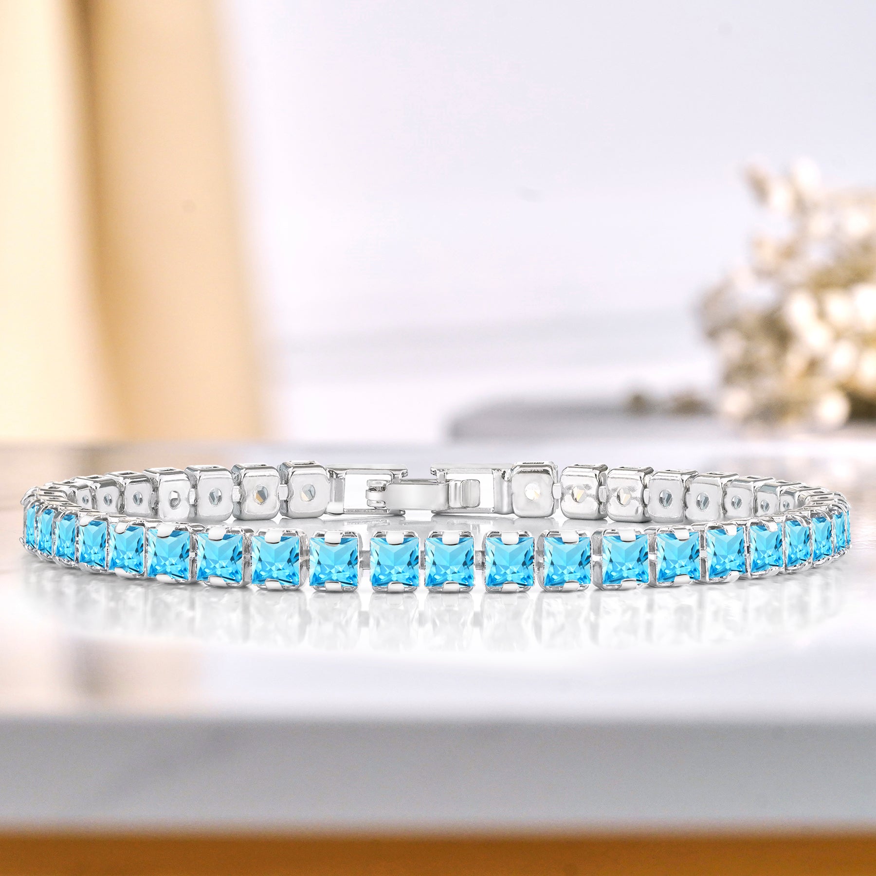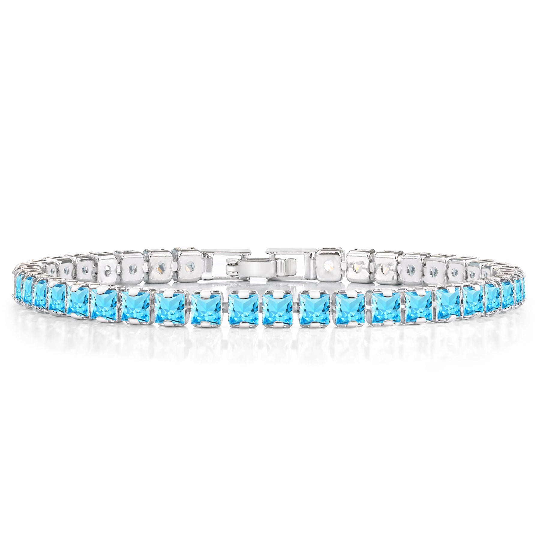 Introducing our exquisite Huge 11 Carat Princess Cut December - Blue Topaz - Birthstone Tennis Bracelet for Women Eternity Design - White Gold Plating, Birthday, Anniversary, Valentine's Day Gift – a dazzling embodiment of elegance and sophistication. This Princess Cut Eternity Cubic Zirconia Tennis Bracelet is the epitome of timeless beauty, designed to add a touch of glamour to any ensemble. Crafted with precision and attention to detail, this December blue topaz cubic zirconia bracelet features brilliant cubic zirconia stones meticulously set in high-quality white gold over brass. The result is a piece that effortlessly combines classic charm with contemporary allure, making it the perfect accessory for any occasion. Each cubic zirconia in this tennis bracelet is selected for its exceptional brilliance and sparkle of genuine diamonds. The stones are delicately arranged in a continuous line, creating a seamless and radiant display that will catch the eye of everyone around you.|Total Carat Weight (All Stones): 11 Carat|Bracelet Style: Tennis Bracelet|Gemstone Shape: Princess Cut|Metal Color: White|Occasion: Birthday, Anniversary, Mother's Day, Everyday Wear, Graduation, Valentine's Day, and More|Chain Length: 7.5 Inches|Condition: New|Age Group: Adult|Gender: Female