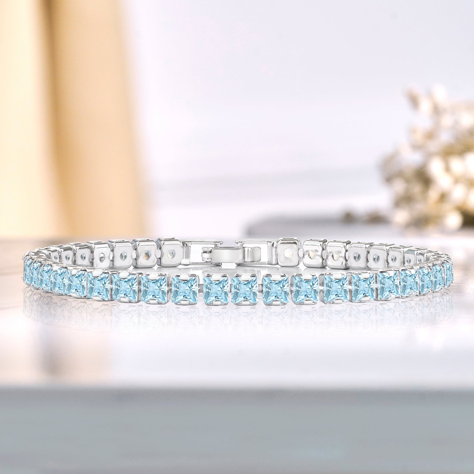 Introducing our exquisite Huge 11 Carat Princess Cut March - Aquamarine - Birthstone Tennis Bracelet for Women Eternity Design - White Gold Plating, Birthday, Anniversary, Valentine's Day Gift – a dazzling embodiment of elegance and sophistication. This Princess Cut Eternity Cubic Zirconia Tennis Bracelet is the epitome of timeless beauty, designed to add a touch of glamour to any ensemble. Crafted with precision and attention to detail, this March aquamarine cubic zirconia bracelet features brilliant cubic zirconia stones meticulously set in high-quality white gold over brass. The result is a piece that effortlessly combines classic charm with contemporary allure, making it the perfect accessory for any occasion. Each cubic zirconia in this tennis bracelet is selected for its exceptional brilliance and sparkle of genuine diamonds. The stones are delicately arranged in a continuous line, creating a seamless and radiant display that will catch the eye of everyone around you.|Total Carat Weight (All Stones): 11 Carat|Bracelet Style: Tennis Bracelet|Gemstone Shape: Princess Cut|Metal Color: White|Occasion: Birthday, Anniversary, Mother's Day, Everyday Wear, Graduation, Valentine's Day, and More|Chain Length: 7.5 Inches|Condition: New|Age Group: Adult|Gender: Female