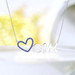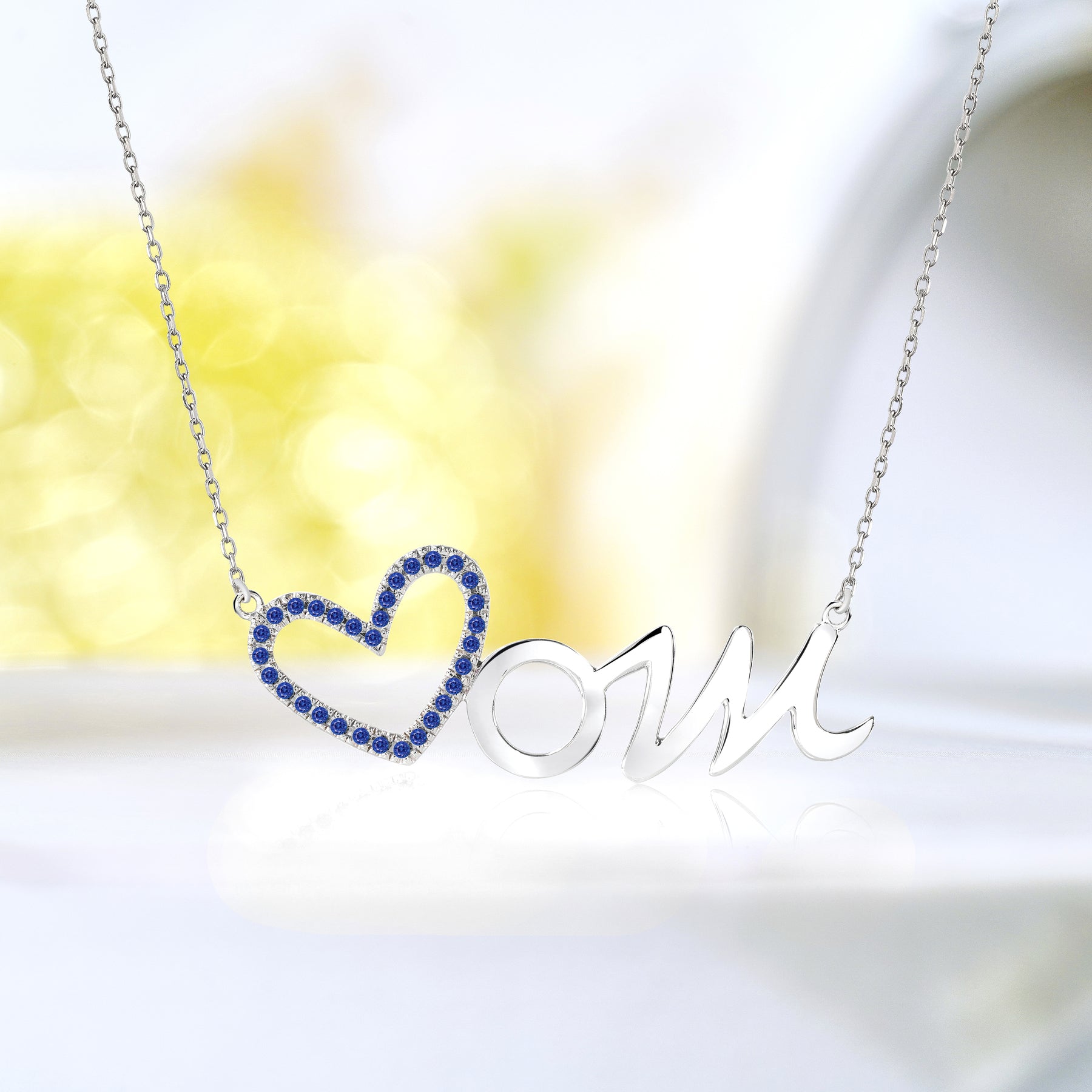 Open Heart Mom with Decorated Dark Blue Stone Pendant Necklace in 18K White Gold over Silver - September Birthstone - Gift for Mom