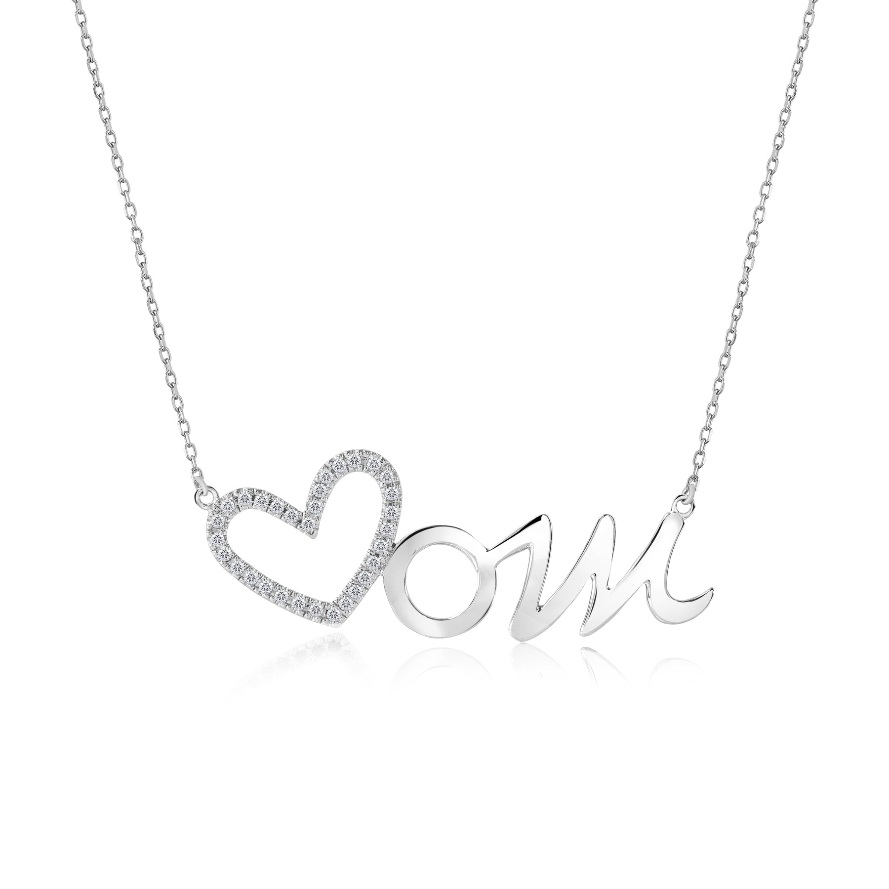 Open Heart Mom with Decorated White Stone Pendant Necklace in 18K White Gold over Silver - April Birthstone - Gift for Mom