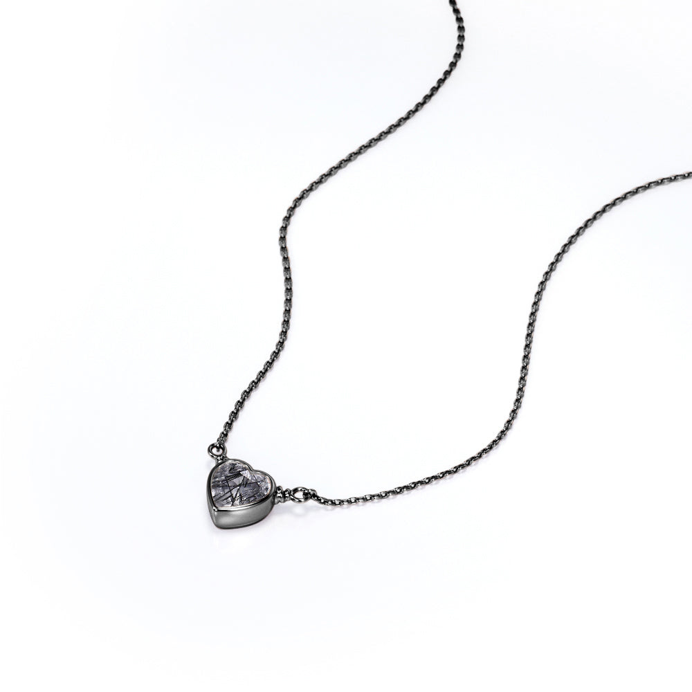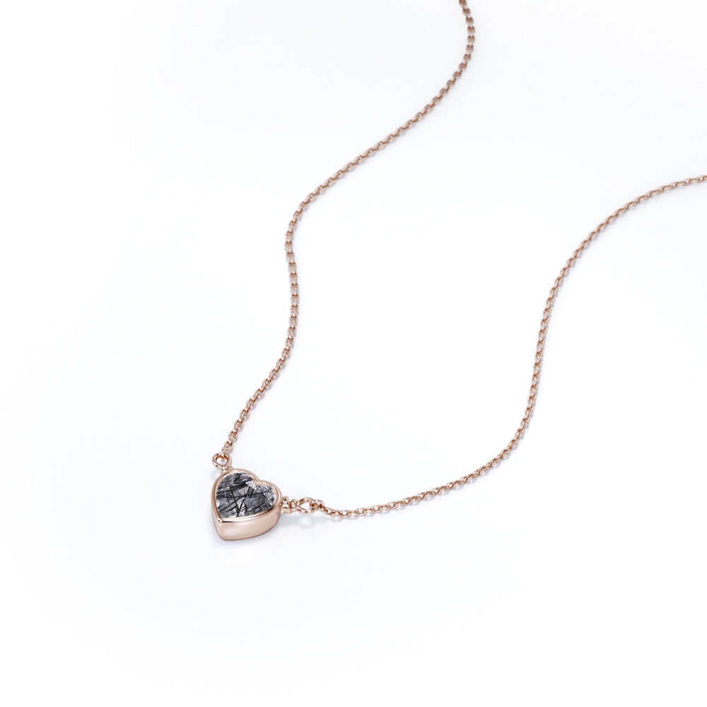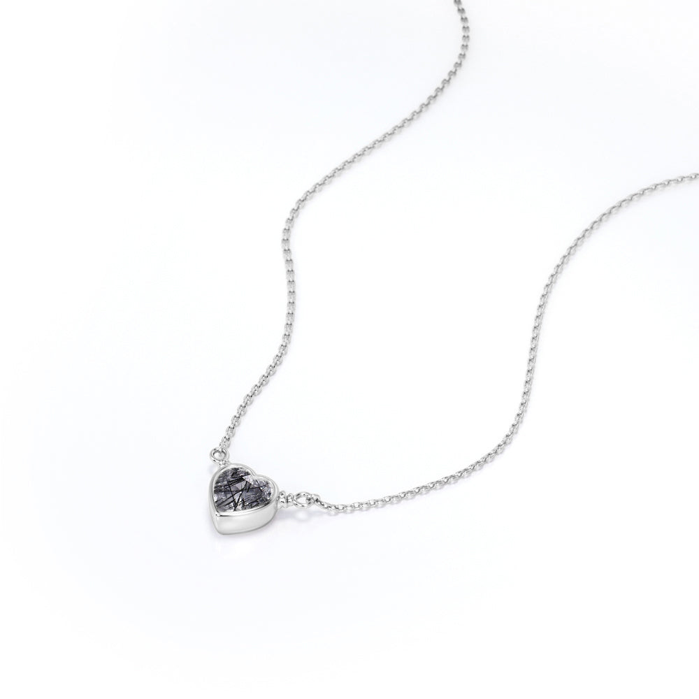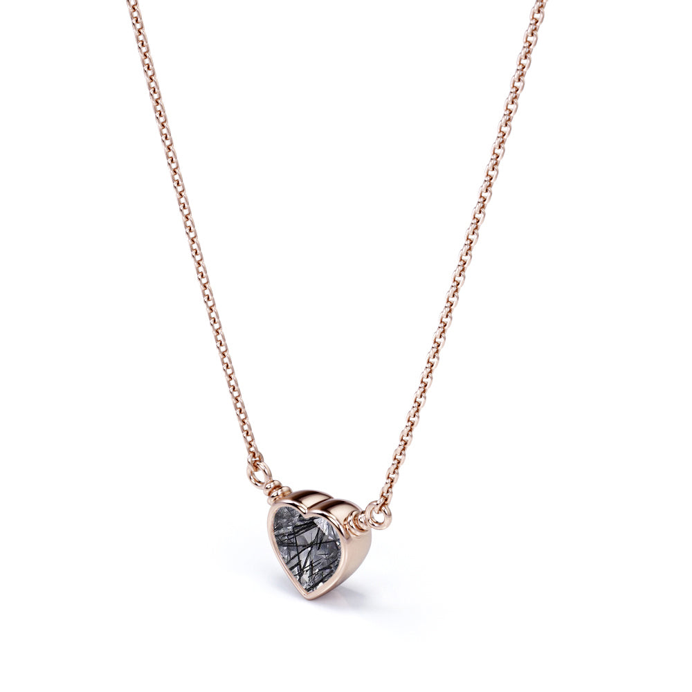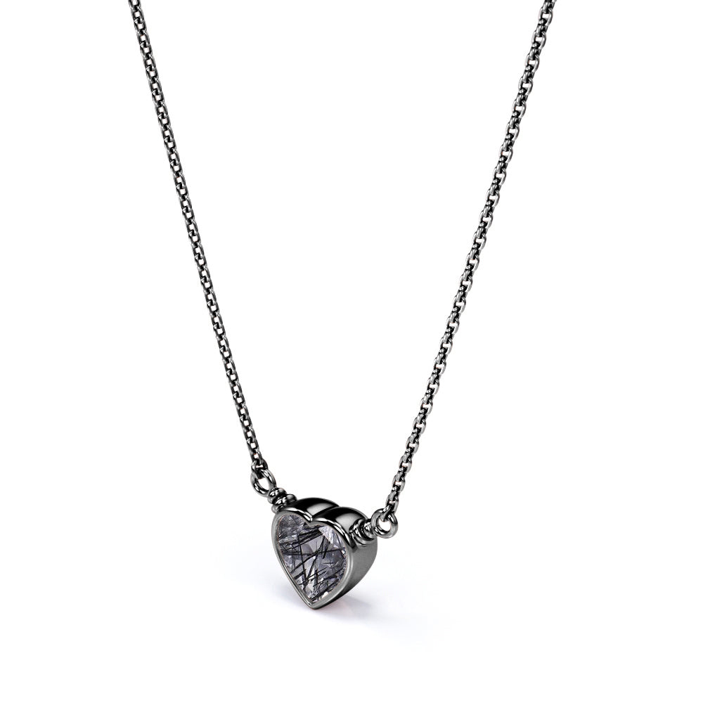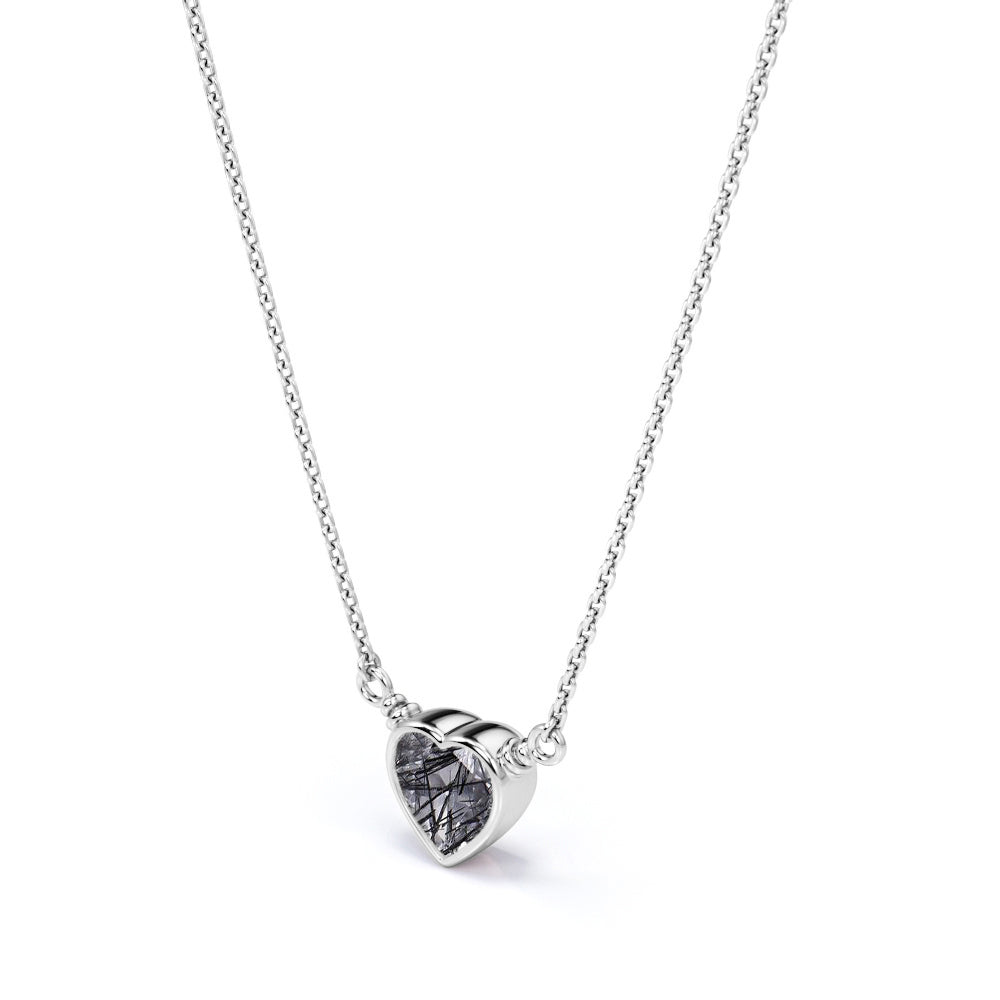 Solitaire 0.5 Carat Heart Shaped Natural Druzy Black Rutile Quartz Bezel Set Pendant Necklace In Black. Pendants make great gifts and are often worn close to the heart. What a better way to profess your love by giving her this mesmerizing heart shaped black rutilated quartz pendant necklace in black gold which can be the absolute representation of your romantic love story that you shall cherish for years to come. One carat heart shaped genuine rutilated quartz is bezel set and exhibits its unique jewel tones. This tantalizing necklace includes a slider clasp to adjust the length. Style this design with heart-shaped earrings for a look filled with self-love. Alternately, surprise someone close to you with this piece as a sign of your affection. Handmade with sincere love and dedication, this romantic 0.5 carat heart shaped natural druzy black rutile quartz bezel set pendant necklace in black gold can also be customized into 18k Gold plating over silver, 10k Gold or 14k Gold as you desire. Grab it now and spread love and only love around.