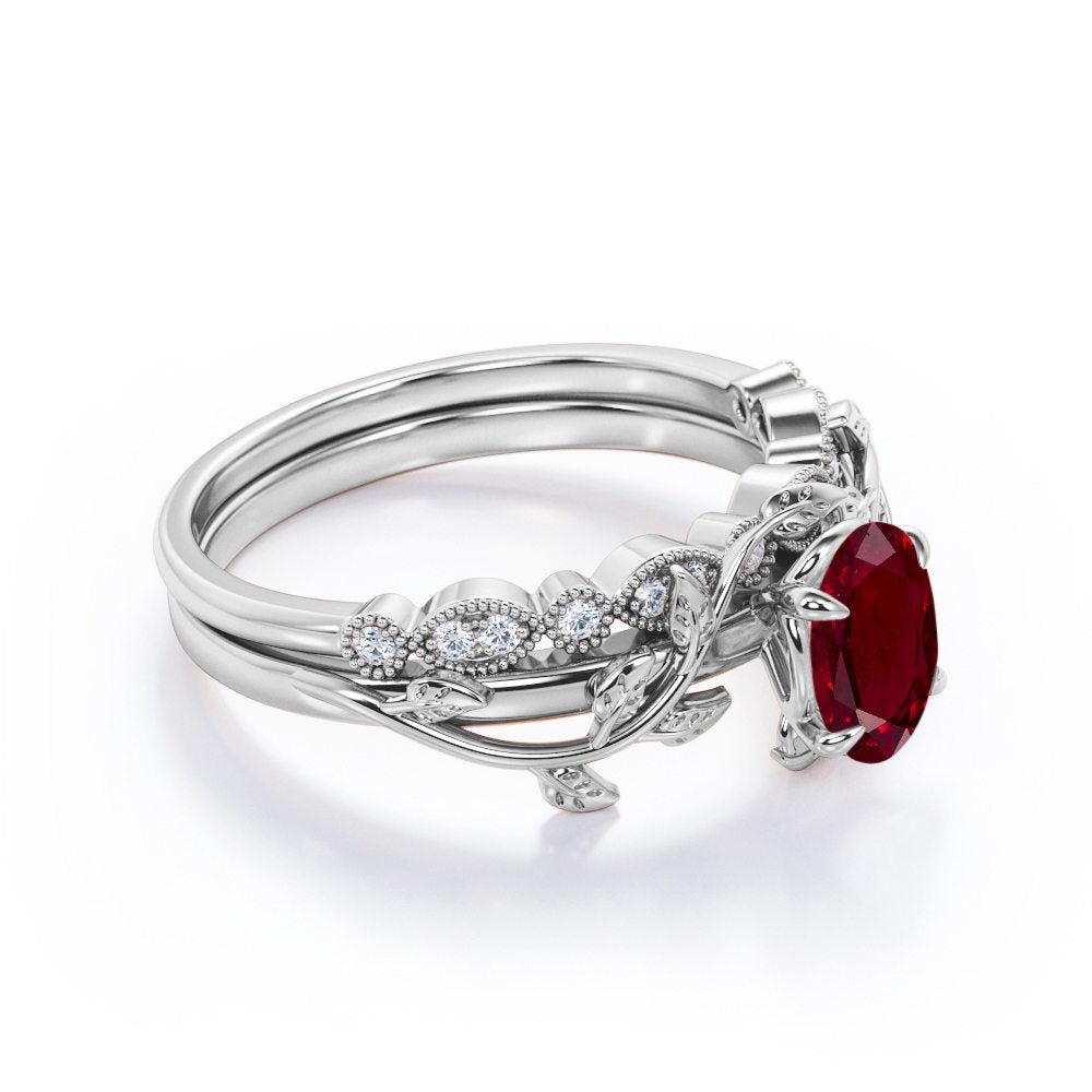 Vintage 1.15 ct Oval Lab-Created Ruby Vine Wedding Set