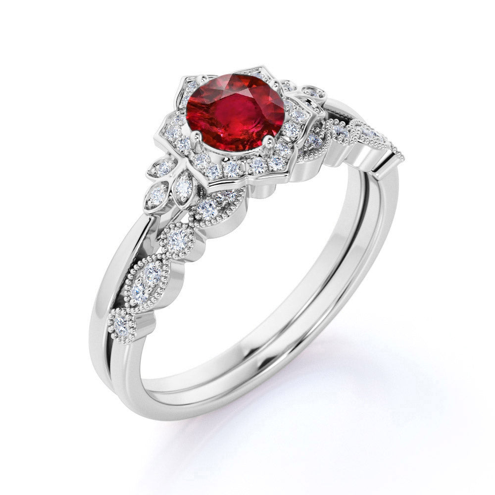 Floral 1.45 ct Round Lab-Created Ruby Vintage Wedding Set
