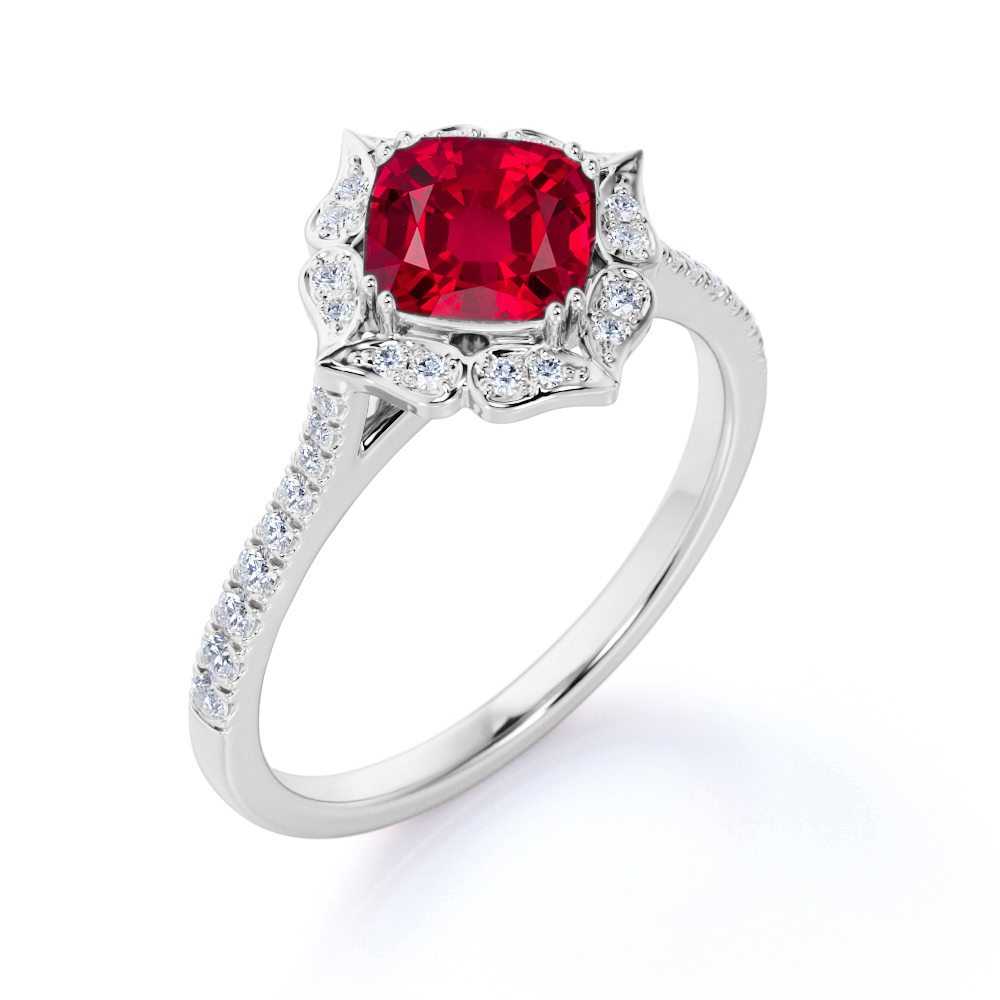 Embrace the enchanting beauty of our Floral Design 1.35 Carat Cushion Cut Lab-Created Ruby and Diamond Halo Engagement Ring in White Gold. Meticulously handcrafted, this exquisite piece of jewelry seamlessly combines elegance and affordability, making it an ideal choice for couples seeking a captivating symbol of their love.The floral design of this ring adds a touch of whimsical elegance, embodying the delicate beauty and grace of nature. Available in four stunning metal colors—white gold, rose gold, yellow gold, and black gold—the Floral Design Ring allows you to find the perfect hue that resonates with your style and preference. Crafted with precision, you can select from silver, 10k, or 14k gold metal variants, ensuring a personalized and extraordinary piece. The side stones of this mesmerizing ring will vary depending on the metal variant chosen. The silver metal variant features glistening moissanite side stones, perfectly complementing the cushion-cut lab-created ruby centerpiece. On the other hand, the 10k and 14k solid gold metal variants boast brilliant diamond side stones, enhancing the ring's allure and radiance.