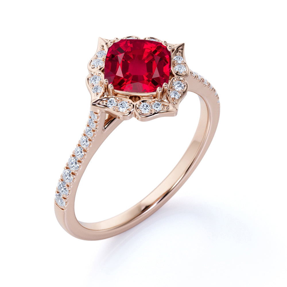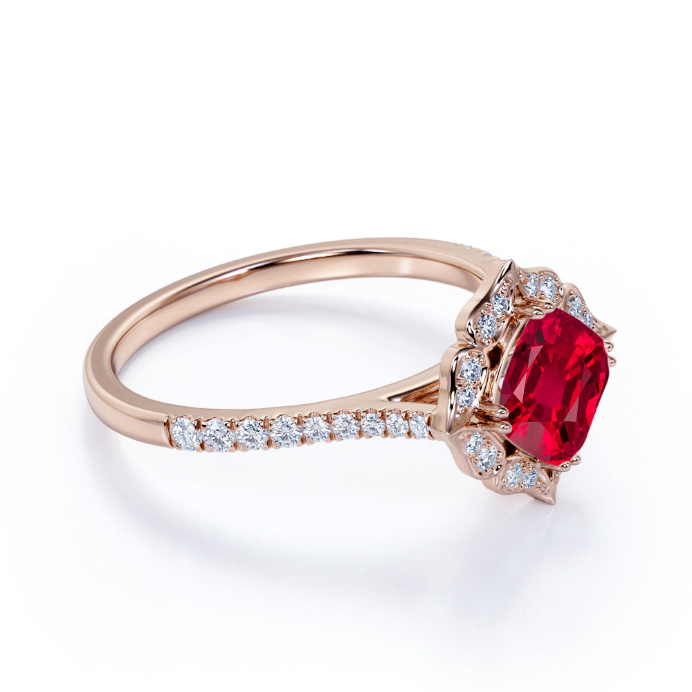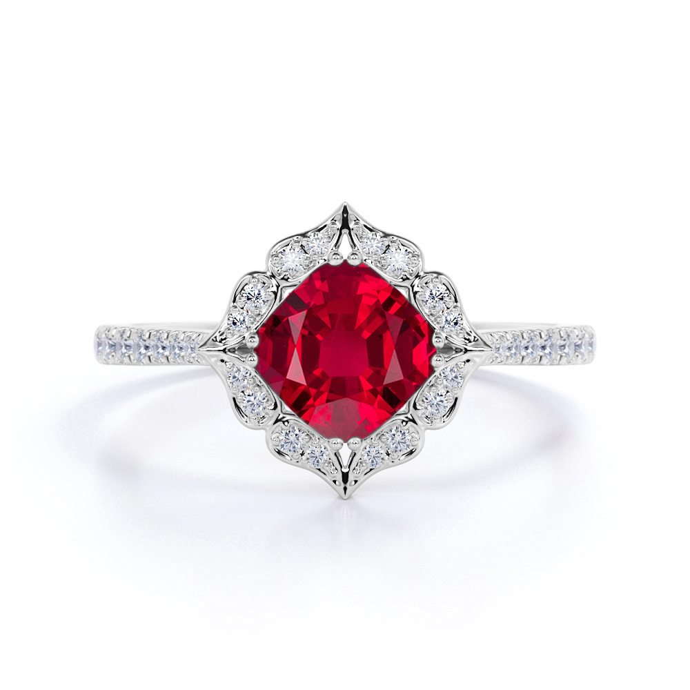Floral 1.35 ct Cushion Lab-Created Ruby Halo Engagement Ring