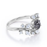 Floral Pattern 1.35 Carat Round Cut Natural Black Rutilated Quartz Nature Inspired Engagement Ring. A subtle statement piece, featuring a unique rutilated quartz stone, on a fine floral design band. Rutilated Quartz are natural stones, with their beauty found in the unique nature of each stone. The iridescent rutilated quartz emits a radiant glow as if it contained the heart of the forest itself. Here, a genuine black rutilated quartz center stone is accented with scattered side stones - marquise shape Cubic Zirconia and round cut moissanites or white diamonds, set in a parallel band. 1 carat rutilated quartz sits in the center held by six prongs and 0.35 carat of cubic zirconia and moissanite or diamonds spreaded over the band in a leaf pattern. This nature inspired engagement ring gives a mystic feminine twist to this art deco floral ring. Handmade with deep love and detailed attention, this floral pattern 1.35 carat round cut natural black rutilated quartz nature inspired engagement ring can also be customized to 18k Gold plating over silver, 10k Gold or 14k Gold as you prefer.