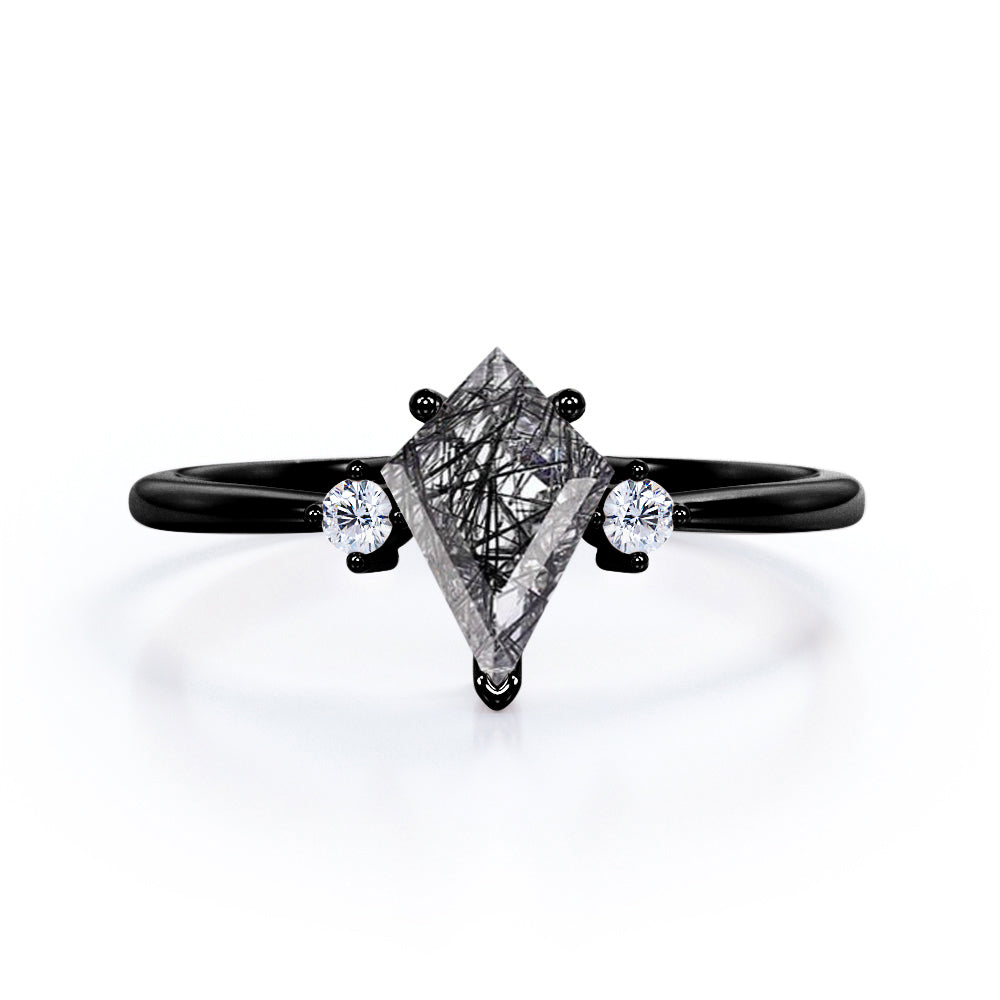 Trilogy 1.10 Carat Kite Shaped Natural Black Hair Rutilated Quartz And Diamond Three Stone Engagement Ring In Black Gold. One of a kind black rutilated quartz ring featuring a kite shaped gem flanked by a pair of white diamonds. We adore the unique look of naturally occurring needle-like inclusions that create a supernatural organic feel. A natural black rutilated quartz ring is good for balancing yin yang energies. The ring features a natural black rutilated quartz center stone of 1 carat with 0.10 carat diamond flanks set in a plain white gold tapered band. This translucent gem glitters with a mythical radiance. Since all of our products are handmade by our well- experienced craftsmen, this trillion 1.10 carat kite shaped natural black hair rutilated quartz and diamond three stone engagement ring in black gold can also be customized into 18k Gold plating over silver, 10k Gold or 14k Gold depending upon your choice. So what are you waiting for? Press add to your cart button now and make this divine engagement ring all yours forever.