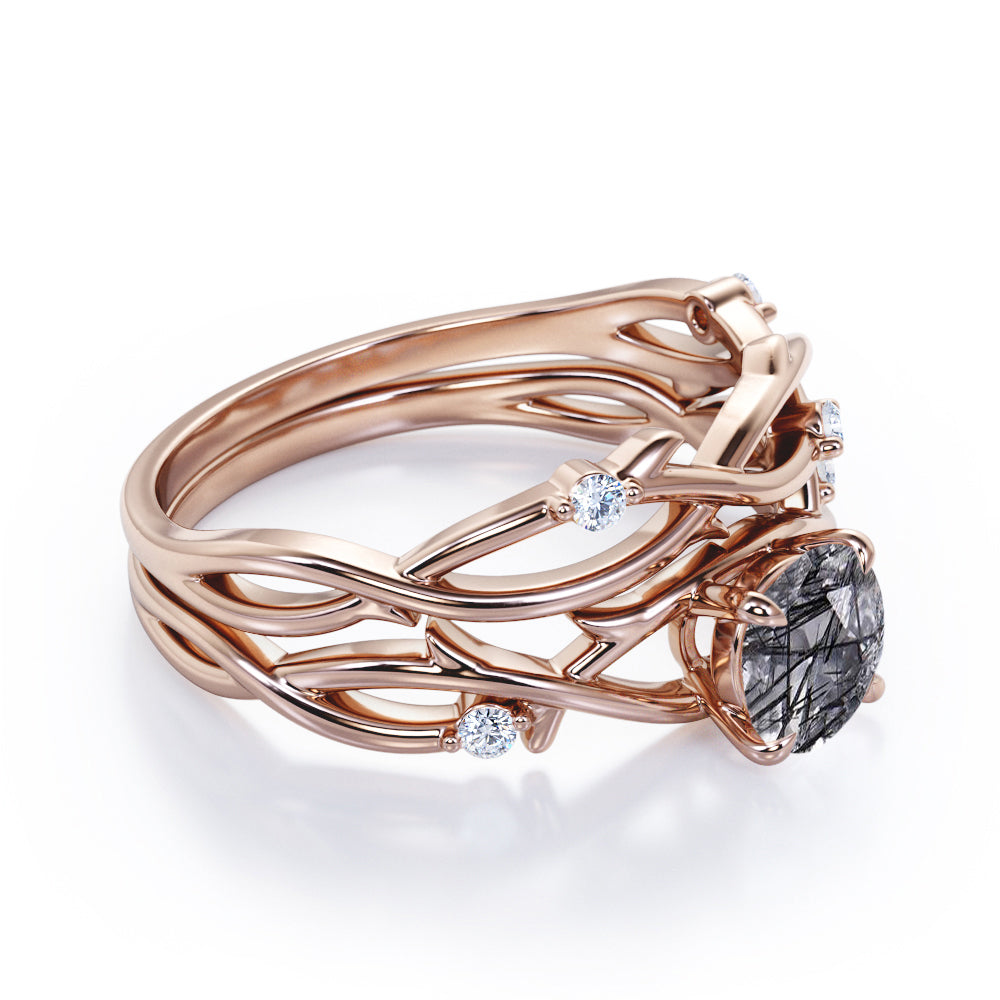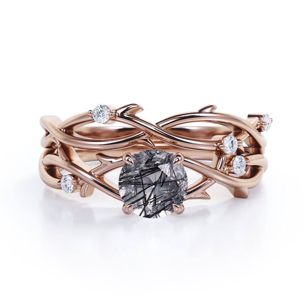 Twisted Leaf Twig 1.15 Carat Brilliant Round Cut Dendritic Black Rutilated Quartz And Diamond Infinity Style Bridal Set In Rose Gold. Delicate and feminine, this black rutilated quartz and diamond twisted leaf ring is certainly unique. A genuine black rutilated quartz stone is set on a rose gold split-shank band with leaf twig detailing .The soft, cool-toned hues of the stone have an entrancing quality about them, emphasized by the white gold crossover band. The combination stands out beautifully on a wide array of skin tones. This nature inspired bridal set features an engagement ring with 1 carat black rutilated quartz as the center stone and 0.15 carat of round dainty white diamonds including the matching infinity wedding band. Customizing your very own ring is the best way to get the look you love at a price point that works for you. As all our products are handmade by our experienced artisans, this twisted leaf twig 1.15 carat brilliant round cut dendritic black rutilated quartz and diamond infinity style bridal set in rose gold can also be customized to 18k Gold plating over silver, 10k Gold or 14k Gold as per your preference.