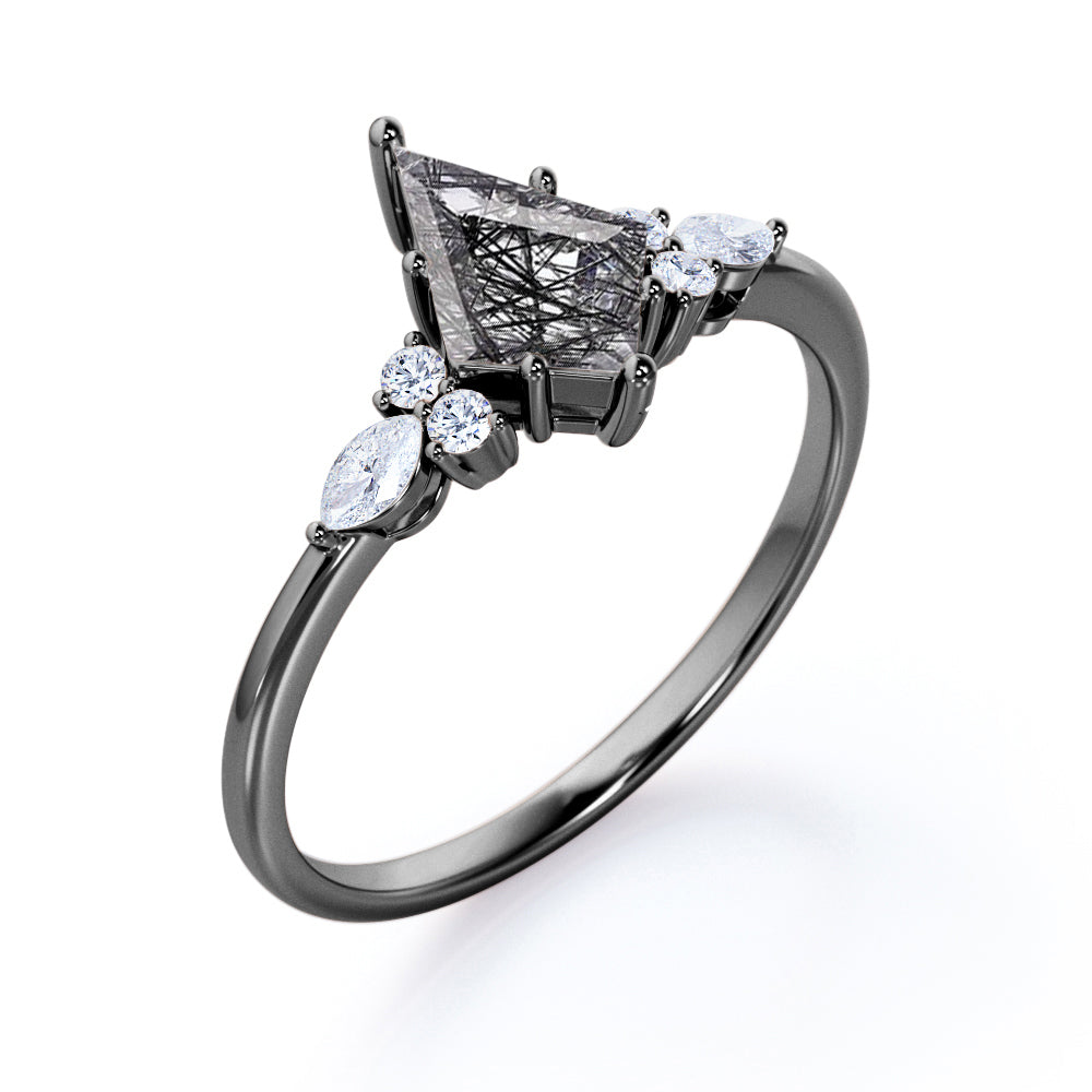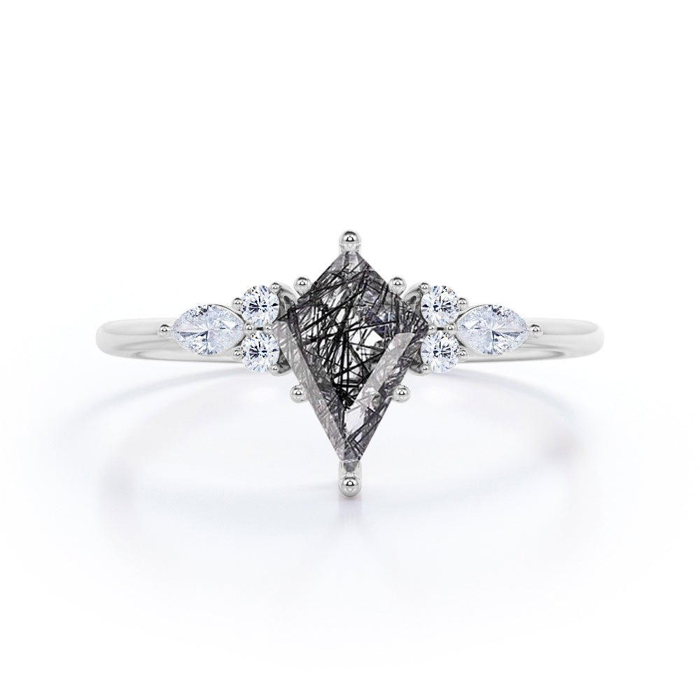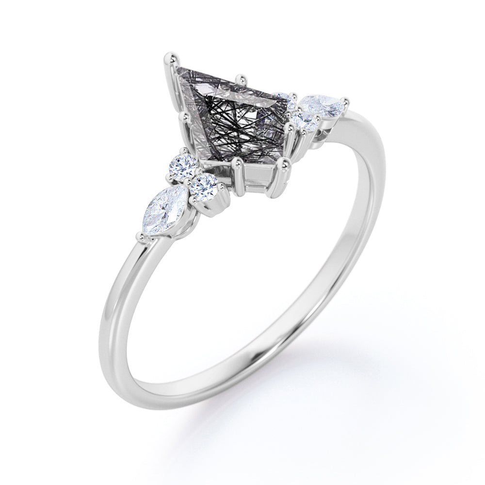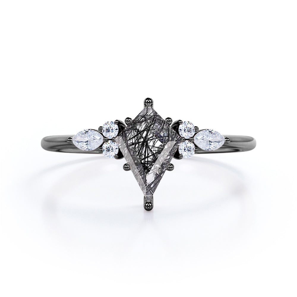 Unique Six Prong 1.30 Carat Kite Shaped Natural Black Rutilated Quartz and diamond Seven Stone Engagement Ring In White Gold. For the brides looking for something very non-traditional, this ring is the perfect choice to go for. The kite shaped engagement ring is set with a natural black rutilated quartz center stone and six small diamonds of mixed marquise and round shape over the white gold band. This seven stone engagement ring features 1 carat black rutilated quartz as the center stone which is set on six prongs along with the side white diamonds stones of 0.30 carat. This unique six prong 1.30 carat kite shaped natural black rutilated quartz and diamond seven stone engagement ring in white gold can also be customized to 18k Gold plating over silver, 10k Gold or 14k Gold as per your choice. If you are looking for the encouragement to remain diligent and determined, this solid black rutilated quartz ring is right choice for you. It is crowned as a highly beneficial crystals to aid wearers in manifesting what they are desire into their lives.