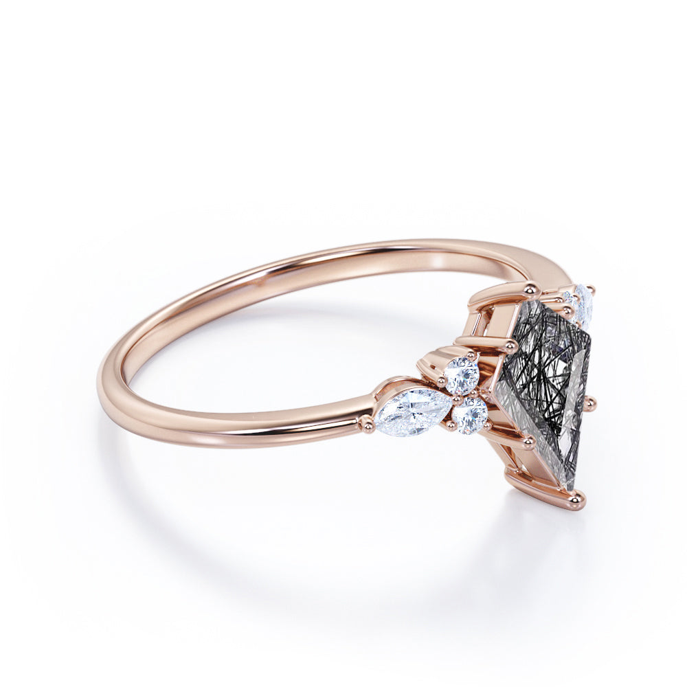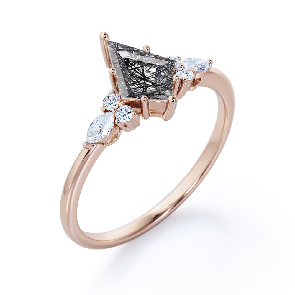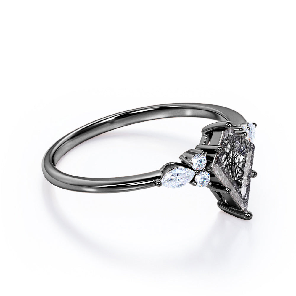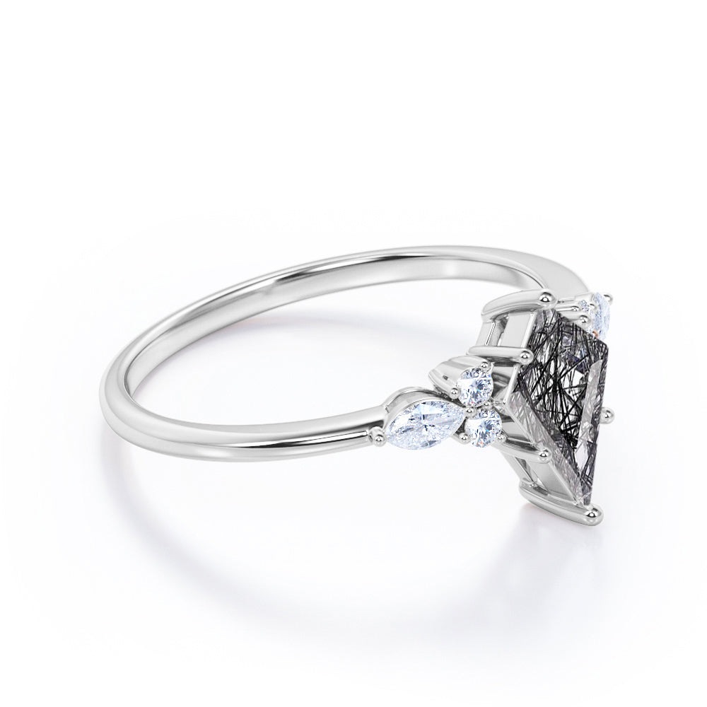 Unique Six Prong 1.30 Carat Kite Shaped Natural Black Rutilated Quartz and diamond Seven Stone Engagement Ring In White Gold. For the brides looking for something very non-traditional, this ring is the perfect choice to go for. The kite shaped engagement ring is set with a natural black rutilated quartz center stone and six small diamonds of mixed marquise and round shape over the white gold band. This seven stone engagement ring features 1 carat black rutilated quartz as the center stone which is set on six prongs along with the side white diamonds stones of 0.30 carat. This unique six prong 1.30 carat kite shaped natural black rutilated quartz and diamond seven stone engagement ring in white gold can also be customized to 18k Gold plating over silver, 10k Gold or 14k Gold as per your choice. If you are looking for the encouragement to remain diligent and determined, this solid black rutilated quartz ring is right choice for you. It is crowned as a highly beneficial crystals to aid wearers in manifesting what they are desire into their lives.