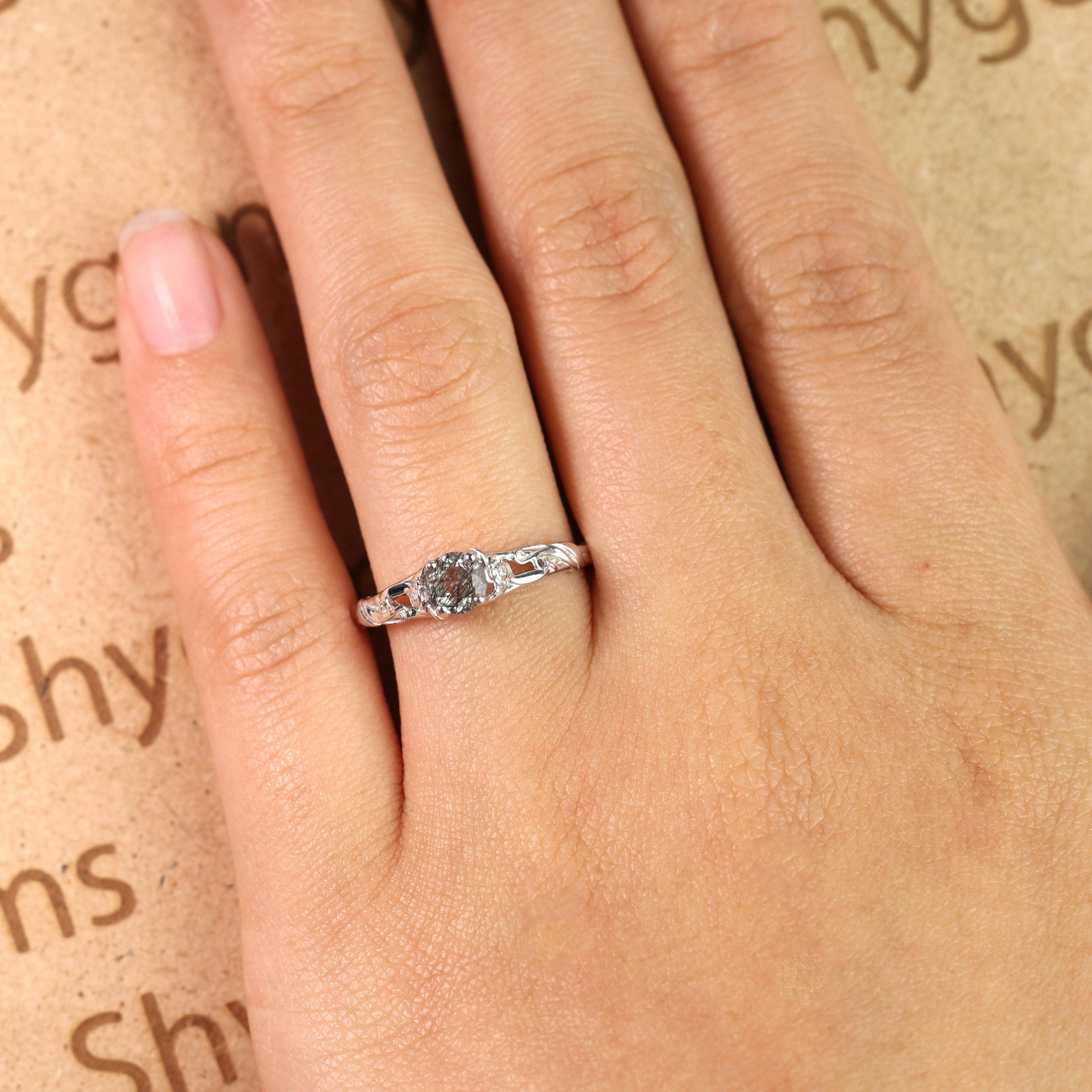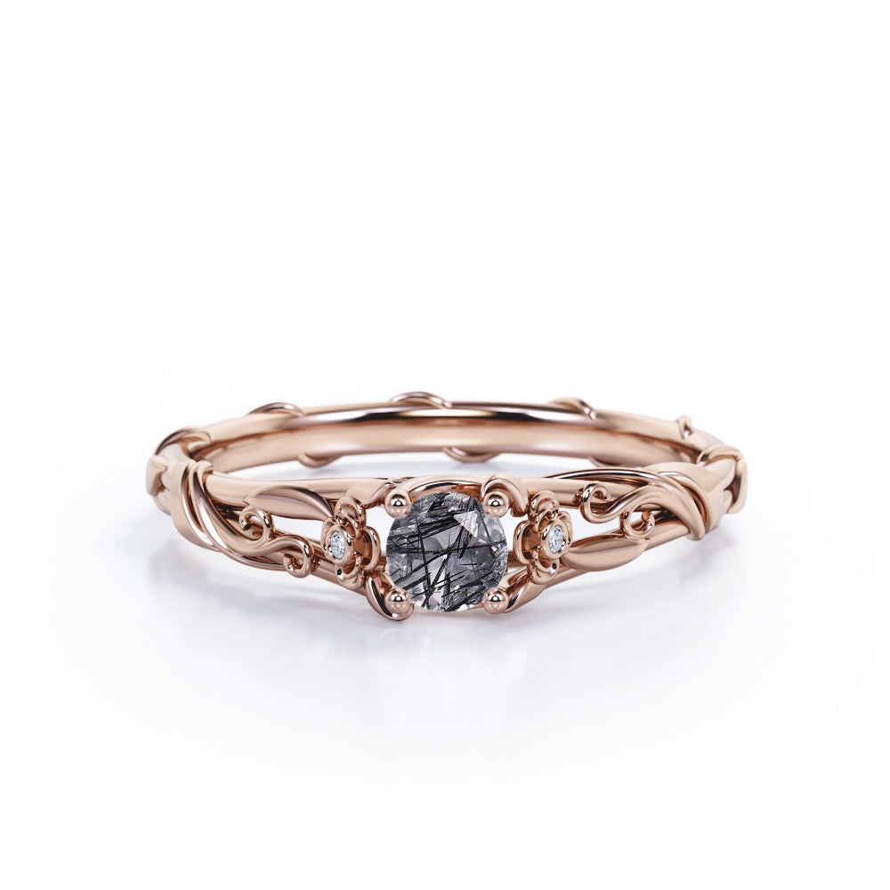Create an incredibly beautiful look on her finger with this Vintage Three Stone 0.65 Carat Round Cut Genuine Black Rutilated Quartz Leaf Design and Diamond Engagement Ring in White Gold. This nature-inspired leaf natural rutilated quartz engagement ring features 0.50 carat round cut real rutilated quartz and .15 carat real side diamond for gold ring and moissanite for silver ring. This vintage 3 stone engagement ring can be customized to either 10k, 14K and Gold over Silver and either Black Gold, Rose Gold, White Gold or Yellow Gold. Also, as your satisfaction is our most priority, we will do our best to have your handmade jewelry be carefully and beautifully crafted by our expert jewelers. The order also comes with a 30-day full refund policy. This clear crystal with black needle inclusions ring will surely be a perfect gift for your significant other. It is crowned as a highly beneficial crystals to aid wearers in manifesting what they are desire into their lives. This tourmalinated black rutilated quartz is believed to be a protection against the ill thoughts of others. The unique dendritic black rutile within its clear quartz will surely complement every style of its wearer. With its distinctive shiny black needles, this genuine druzy rutilated quartz ring is sure to be eye-catching and bring all eyes on you. This ring is available at a very affordable price and available in both silver and gold ring. While many gemstones are most valuable when they contain few or no inclusions, rutilated quartz is actually prized because of its unique inclusions. Being an uplifted stone, this rutilated quartz ring infuses joy into your life and surrounding environment. Embellish her finger with this ring which is perfect for any occasion and everyday wear. With its mesmerizing patters of colors and inclusions, this rutilated quartz ring will enchant your special someone with gracefulness.