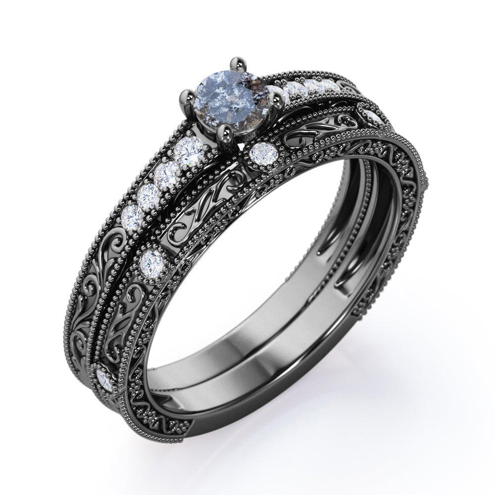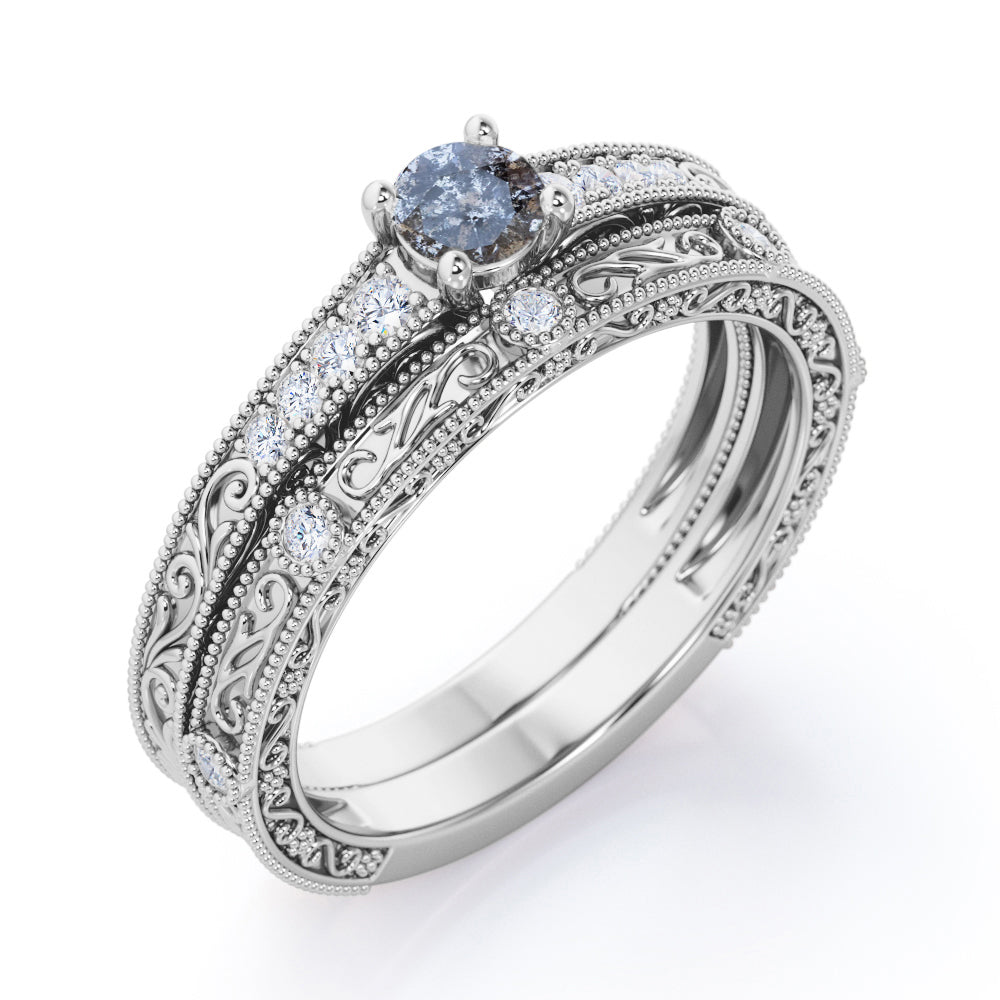 Art Deco 0.55 Carat Round Cut Icy Grey Salt And Pepper Diamond Vintage Inspired Wedding Ring Set In White Gold. For the more unconventional bride, consider opting for salt and pepper diamond instead of the traditional white diamond. The ring's iridescence is complemented by the sheen of this delicate white gold band. Plus, the art deco work with milgrain detail just exudes vintage drama. The solitaire salt and pepper diamond is holded firmly by the four prongs and the vintage milgrain work all over the edges is highly commendable.This art deco 0.55 carat round cut translucent salt and pepper diamond vintage milgrain engagement ring in white gold can also be customized to 18k Gold plating over silver, 10k Gold or 14k Gold as per your preference. This alluring wedding ring set comprises of one engagement ring which has 0.33 carat salt and pepper diamond as the center stone and 0.22 carat of side diamonds with a matching wedding band to complete your ensemble.